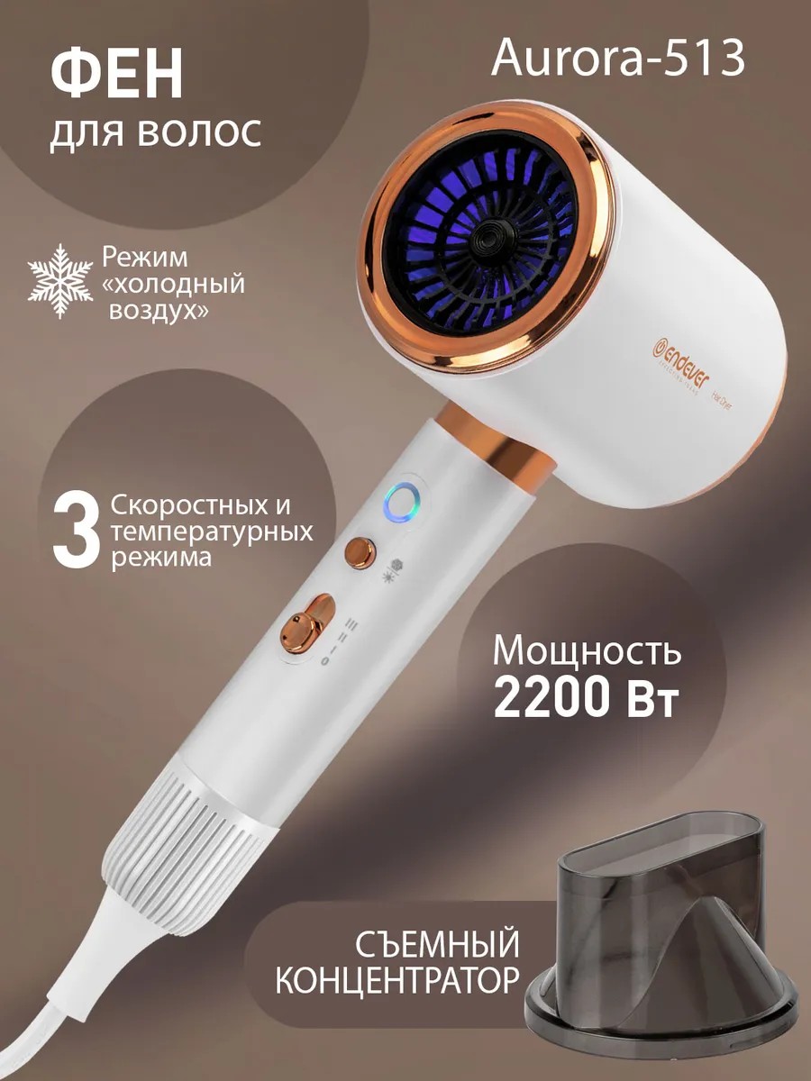 Подарите своим волосам ту заботу, которую они заслуживают, с феном Endever Aurora-513! С мощностью 2200 Вт и инновационными функциями этот фен стал настоящим помощником для создания идеальной прически. Больше не нужно выбирать между скоростью и бережным уходом — благодаря двум режимам мощности и трем температурным режимам вы сможете точно настроить поток воздуха под ваши нужды.