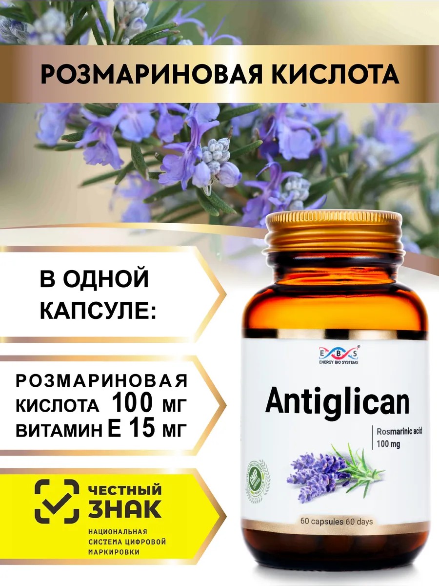 Антигликан от компании Энерго Био Системы имеет в составе растительный экстракт розмарина 500 мг на капсулу с 20% содержанием розмариновой кислоты, что составляет 100 мг, и антиоксидант витамин Е.