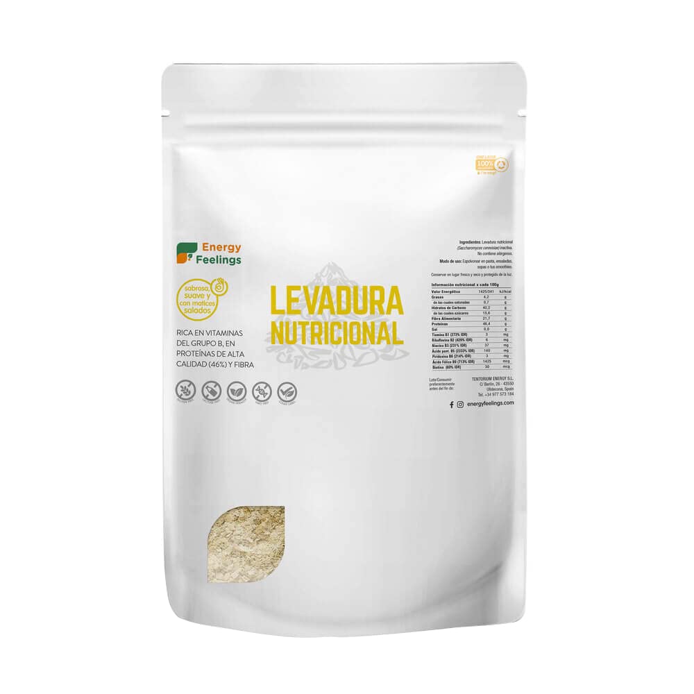 Energy Feelings High-Viability Nutritional Yeast is an excellent superfood for enriching the nutritional value of any dish. It is exceptionally rich in all the B vitamins. Just 10g provides the daily reference intake of vitamins B1, B2, B3, B5, B6, B9, and the valuable B12. It is also a great source of zinc. It also contains calcium, magnesium, iron, and copper. Source of natural dietary fiber. INGREDIENTS Inactive yeast flakes (Saccharomyces cerevisiae)