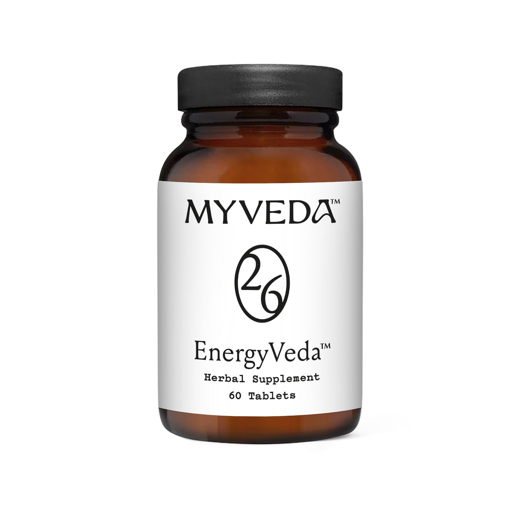 EnergyVeda 26 is an Ayurvedic blend of 26 herbs that help restore energy, balance the nervous system, and support overall vitality. With Ashwagandha, Amla, Velvet Bean, and Asparagus, this formula nourishes the body's seven tissues (dhatu), helping reduce fatigue and promote resilience. It also supports mental clarity, emotional balance, and natural immunity, making it a daily tonic for holistic well-being. Vegan, non-GMO, and crafted in Kerala, India with authentic Ayurvedic wisdom.