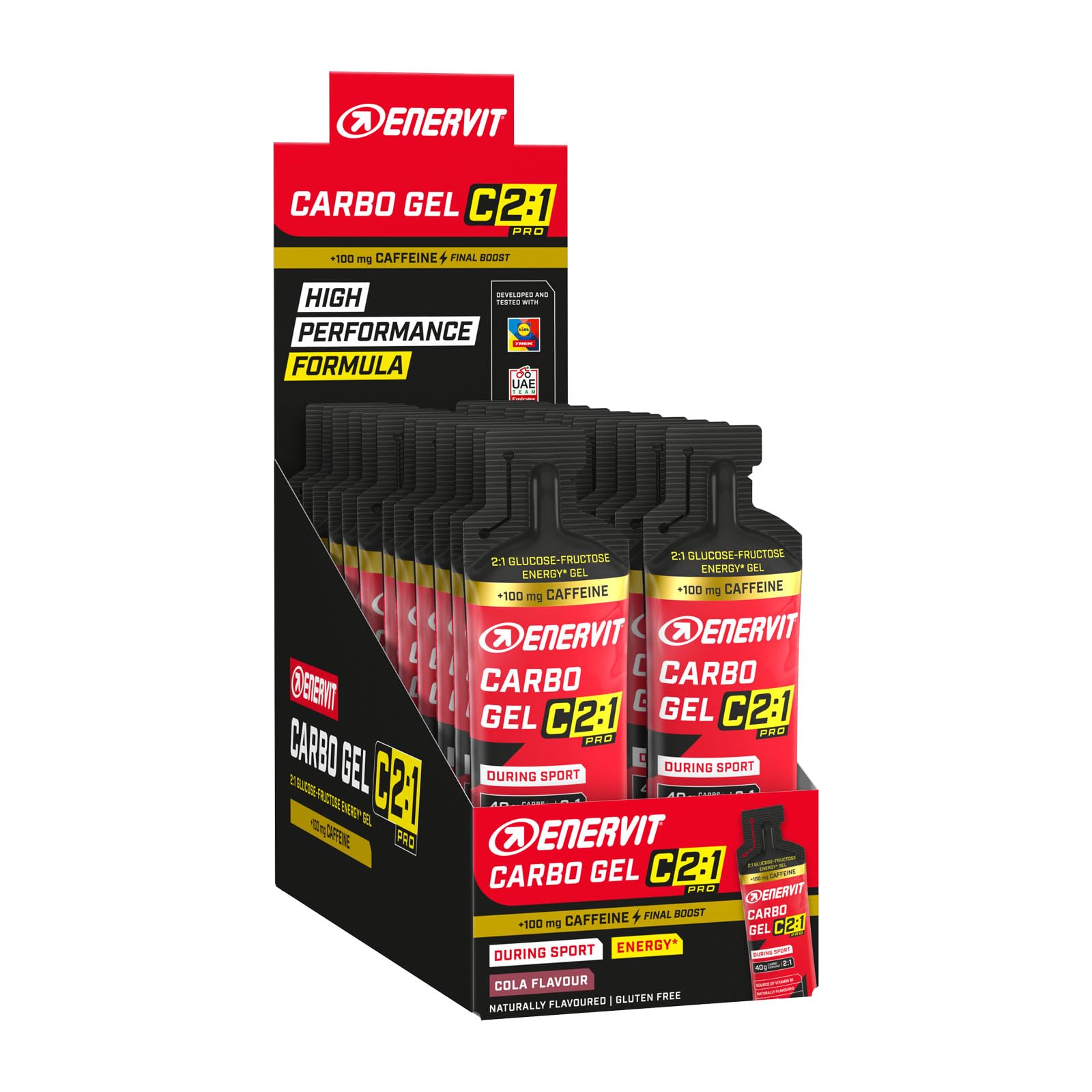 Enervit Carbo Gel C2:1PRO with caffeine is an innovative energy gel developed specifically to support you during intense sporting activities. This gel is formulated with a combination of maltodextrin and fructose in a 2:1 ratio, providing 40g of carbohydrates per 60ml gel. It is also enriched with 100mg of caffeine to give you an extra boost during your final sprint. This energy gel is fat-free and gluten-free, making it suitable for a variety of dietary needs. It also contains vitamin B1 to support your energy metabolism. Its consistency has been designed to promote optimal carbohydrate absorption, allowing you to maximize your performance during sporting activity. Enervit Carbo Gel C2:1PRO with caffeine was developed in collaboration with top athletes, including UCI World Tour teams, LIDL Segafredo, and UAE Team Emirates. This gel will help you push your limits in long-duration, high-intensity endurance activities. You can take up to two gels during physical activity, providing a total of 80g of carbohydrates and 200mg of caffeine. It is important to use this product as part of a balanced diet and a healthy lifestyle. Enervit Carbo Gel C2:1PRO with caffeine is the ideal energy gel to push you beyond your limits and maximize your athletic performance. Try it today and challenge your limits with Enervit! INGREDIENTS Water - Maltodextrin (36.4 ) - Fructose (18.2 ) - Acidifier: citric acid - Thickener: xanthan gum - Natural flavorings - Caffeine (0.135 ) - Preservative: potassium sorbate - Nicotinamide - Pyridoxine hydrochloride - Thiamine mononitrateTaste and consistency: The gel has a cola flavor and moderate sweetness despite its high energy density. Its consistency was designed to facilitate the absorption of a high carbohydrate content. Health benefits: In addition to being gluten-free and fat-free, the gel contains vitamin B1. The product should be used as part of a varied and balanced diet and a healthy lifestyle. CAFFEINE BOOST - Each gel contains 100 mg of caffeine, giving you a boost for your final sprint. Take up to two gels during physical activity to maximize performance. Innovative formula: This energy gel combines maltodextrin and fructose in a 2:1 ratio, allowing you to exceed 60 g of carbohydrates per hour and reach over 90 g, minimizing the risk of intestinal stress. Athletic performance: Enervit C2:1PRO energy gel was developed with top athletes to support intense athletic performance. Ideal for long-duration and high-intensity endurance activities.Enervit Carbo Gel C2:1PRO avec caféine, gel énergétique avec 40 g de glucides, activités de haute intensité, 50 de glucides absorbés, goût de colle, sans gluten, haute digestibilité, 24 packs de 60 Caféine Paquete de 24DESCRIPTION DU PRODUIT DESCRIPTION DU PRODUIT Enervit Carbo Gel C2:1PRO à la caféine est un gel énergétique innovant développé spécialement pour vous soutenir pendant vos activités sportives intenses. Ce gel est formulé avec une combinaison de maltodextrines et de fructose dans un rapport de 2:1, fournissant 40 g de glucides par gel de 60 ml. De plus, il est enrichi en 100mg de caféine pour vous donner un coup de pouce supplémentaire lors de votre sprint final. Ce gel énergétique est sans graisse et sans gluten, ce qui le rend adapté à différents besoins alimentaires. Il contient également de la vitamine B1 pour soutenir votre métabolisme énergétique. Sa consistance a été conçue pour favoriser l'absorption optimale des glucides, vous permettant de maximiser vos performances pendant l'activité sportive. Enervit Carbo Gel C2:1PRO à la caféine a été développé en collaboration avec les meilleurs athlètes, y compris les équipes UCI World Tour, LIDL Segafredo et UAE Team Emirates. Ce gel vous aidera à repousser vos limites dans des activités d'endurance de longue durée et de haute intensité. Vous pouvez prendre jusqu'à deux gels pendant l'activité sportive, fournissant un total de 80 g de glucides et 200 mg de caféine. Il est important d'utiliser ce produit dans le cadre d'une alimentation équilibrée et d'un mode de vie sain. Enervit Carbo Gel C2:1PRO à la caféine est le gel énergétique idéal pour vous pousser au-delà de vos limites et maximiser vos performances sportives. Essayez-le dès aujourd'hui et défiez vos limites avec Enervit! INGRÉDIENTS Eau - Maltodextrine (36,4 ) - Fructose (18,2 ) - Acidifiant : acide citrique - Épaississant : gomme xanthane - Arômes naturels Caféine (0,135 ) - Conservateur : sorbate de potassium - Nicotinamide - Chlorhydrate de pyridoxine - Mononitrate de thiamine.Goût et consistance : le gel a un goût de cola et une douceur modérée malgré sa haute densité énergétique. Sa consistance a été conçue pour faciliter l'apport d'une teneur élevée en glucides. Avantages pour la santé : en plus d'être sans gluten et sans graisses, le gel contient de la vitamine B1. Le produit doit être utilisé dans le cadre d'une alimentation variée et équilibrée et d'un mode de vie sain. BOOST DE CAFÉINE - Chaque gel contient 100 mg de caféine, donnant un coup de pouce à votre sprint final. Prendre jusqu'à deux gels pendant l'activité sportive pour maximiser les performances. Formule innovante : ce gel énergétique combine les maltodextrines et le fructose dans un rapport de 2:1, permettant de dépasser 60 g de glucides par heure et d'atteindre plus de 90 g, minimisant les risques de stress intestinal. Performance sportive : le gel énergétique Enervit C2:1PRO a été développé avec les meilleurs athlètes pour soutenir les performances sportives intenses. Idéal pour les activités d'endurance de longue durée et de haute intensité.