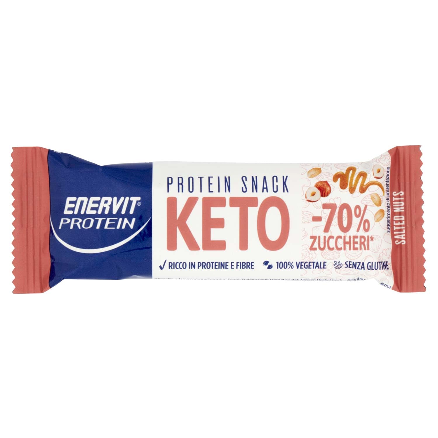 INGREDIENTS tapioca starch, natural flavouring, cocoa butter, dried coconut (5.2 ), emulsifier: lecithin, hydrolyzed chicory fibre, acacia gum, peanut grains (12 ), almond grains (17 ), roasted hazelnut grains (5 ), cashew nut paste (8.3 ), pea prot. white (8, 10 ), soy (7, may contain traces of milk, sesame, other nuts, salt, medium chain triglycerides from coconut oil (mct) (1 ) (1 ), humectant: glycerin INSTRUCTIONS FOR USE Direct consumption from the package.Enervit Protein Keto Snack Salted Nuts 35 G INGREDIËNTEN tapiocazetmeel, natuurlijk aroma, cacaoboter, gedroogde kokosnoot (5,2 ), emulgator: lecithine, gehydrolyseerde cichoreivezel, acaciagom, pindakorrels (12 ), amandelkorrels (17 ), geroosterde hazelnootkorrels (5 ), cashewnotenpasta (8, 3 ), erwtenprot. wit (8, 10 ), soja (7, kan sporen bevatten van melk, sesam, andere noten, zout, middellange keten triglyceriden uit kokosolie (mct) (1 ) (1 ), bevochtigingsmiddel: glycerine GEBRUIKSAANWIJZING Directe consumptie uit de verpakking.
