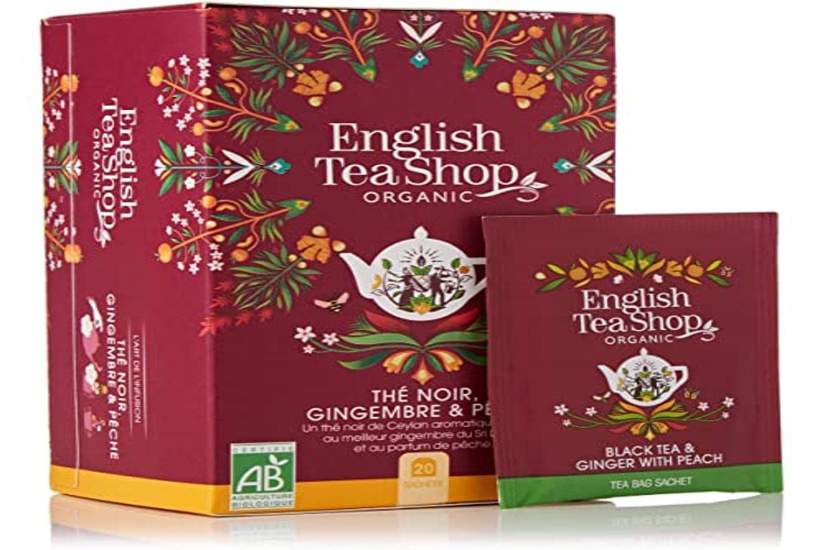 English Tea Shop - Thé noir gingembre et pêche bio - Thé noir biologique de Ceylan au gingembre et à la pêche - Boite de 20 sachet de thé noir
