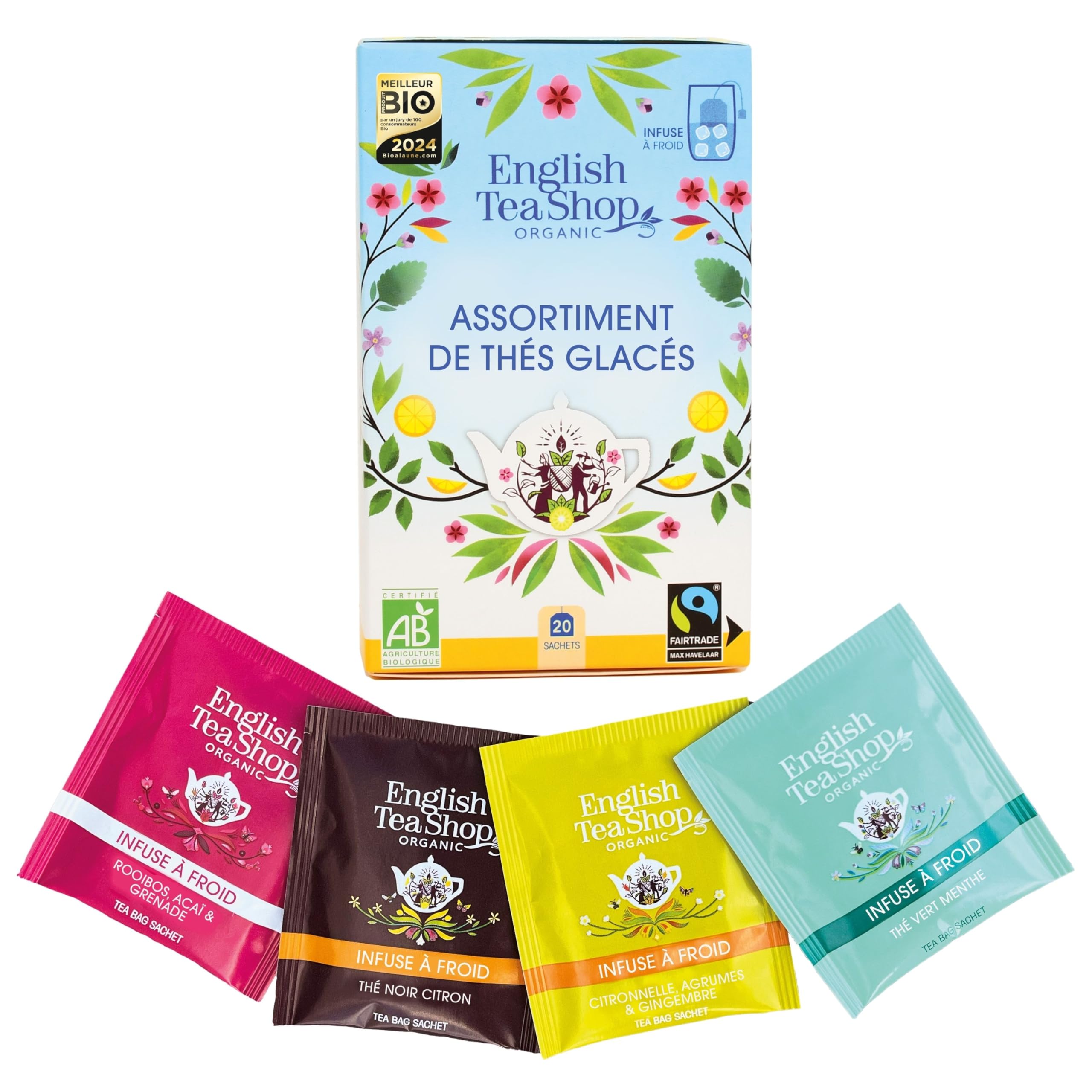 4 ORGANIC ICED TEAS TO DISCOVER: fruity creations to be cold infused to create iced teas in a few minutes INGREDIENTS Mint Green Tea: green tea (82 ), peppermint (8 ), spearmint (6 ), peppermint flavoring (4 ). Lemon Black Tea: Ceylon black tea (74 ), lemongrass (17 ), natural lemon flavoring (5 ), lemon zest (4 ). Lemongrass, Citrus Ginger: lemongrass (49 ), orange pieces (24 ), ginger (22 ), lime flavoring (2.5 ), mandarin flavoring (2.5 ). Rooibos, Acai Pomegranate: rooibos (59.5 ), honeybush (17 ), hibiscus (14.5 ), natural blueberry flavor (4 ), natural pomegranate flavor (3 ), pomegranate (1 ), raspberry (0.5 ), acai berry (0.5 ). ( ) Ingredients from organic farming. DIRECTIONS FOR USE Infuse tea in cold water SAFETY WARNING Decaffeinated, suitable for children and pregnant women WHY ENGLISH TEA SHOP? Choosing English Tea Shop teas and infusions means taking part in the tea revolution we launched in 2010. When we created our tea brand, our ambition was clear. We wanted to create a thriving environment for farmers, the entire tea industry, and our entire community. EXCEPTIONAL ORGANIC ICED TEAS AND COLD INFUSIONS: English Tea Shop combines the expertise of Ceylon farmers with the tradition of old-fashioned tea time. From the people who plant your tea to those who pack it, everyone involved is committed to creating delicious organic teas that you can enjoy at home. ? ECO-FRIENDLY ORGANIC TEA BAGS: Our box of 20 tea bags is designed to be the everyday tea size. Our tea bags are made up of two chambers to guarantee you a better infusion. They are made of unbleached paper, without glue and without staples, which allows them to be biodegradable. REAL ORGANIC TEA LEAVES: all the ingredients of our cold brew iced teas comply with the cultivation, production, transport and storage standards certified by Ecocert. We are associated with Fairtrade Max Havelaar for the certification of our relevant products. Our Bcorp certification rewards our actions carried out over the past 12 years to revolutionize the tea market. We obtained the exceptional score of 117.8. ? DRINK YOUR SUGAR-FREE FLAVORED WATER ALL SUMMER LONG: with our 4 cold infusion recipes, create refreshing sugar-free drinks with 100 natural ingredients. Our iced mint green tea and our iced lemon black tea will be your allies for the summer. Our iced lemongrass, citrus ginger infusion will accompany you all year round. Enjoy a caffeine-free iced tea with our organic Rooibos, Acai, and Pomegranate cold infusion. COLD INFUSION ICED TEA: an assortment of 4 fruity cold brew creations to easily create organic iced teas. This small assortment offers 2 iced teas and 2 exotic cold infusions specially designed to be brewed directly in cold water. Thanks to a unique drying process and careful selection of ingredients, these 4 blends release all their aromas even in cold water. Ideal for making delicious organic iced teas in just a few minutes. 4 THÉ GLACÉS BIO À DÉCOUVRIR : des créations fruitées à infuser à froid pour créer des thés glacés en quelques minutes INGRÉDIENTS Thé Vert Menthe : thé vert (82 ), menthe poivrée (8 ), menthe verte (6 ), arôme de menthe poivrée (4 ). Thé Noir Citron : thé noir de Ceylan (74 ), citronnelle (17 ), arôme naturel de citron (5 ), zeste de citron (4 ). Citronnelle, Agrumes Gingembre : citronnelle (49 ), pièces d'orange (24 ), gingembre (22 ), arôme de citron vert (2,5 ), arôme de mandarine (2,5 ). Rooibos, Açaï Grenade : rooibos (59,5 ), honeybush (17 ), hibiscus (14,5 ), arôme naturel de myrtille (4 ), arôme naturel de grenade (3 ), grenade (1 ), framboise (0,5 ), baie d'açaï (0,5 ). ( ) Ingrédients issus de l'agriculture biologique. MODE D'EMPLOI Infuser le thé dans de l'eau froide AVERTISSEMENT DE SÛRETÉ Décaféiné, convient aux enfants et aux femmes enceintes POURQUOI ENGLISH TEA SHOP ? Choisir les thés et les infusions English Tea Shop, c'est prendre part à la révolution du thé que nous avons lancé en 2010. En créant notre marque de thé, notre ambition était claire. Nous souhaitions créer un environnement prospère pour les agriculteurs, l'ensemble de la filière du thé et toute notre communauté. DES THÉS GLACÉQ ET INFUSIONS FROIDES BIO D'EXCEPTION : English Tea Shop associe le savoir-faire des agriculteurs de Ceylan à la tradition du tea time à l'ancienne. Des personnes qui plantent votre thé à celles qui l'emballent, toutes les personnes impliquées ont à cœur de créer de délicieux thés biologiques que vous pourrez déguster chez vous. ? SACHET DE THÉ BIO ÉCO-RESPONSABLE : notre boîte de thé de 20 sachets est pensée pour être le format de thé du quotidien. Nos sachets sont composés de deux chambres pour vous garantir une meilleure infusion. Ils sont en papier non blanchi, sans colle et sans agrafe, ce qui leur permet d'être biodégradables. VRAIES FEUILLES DE THÉS BIO : tous les ingrédients de nos thés glacés à infuser à froid respectent les standards de culture, de production, de transport et de stockage certifiés par Ecocert. Nous sommes associés à Fairtrade Max Havelaar pour la certification de nos produits concernés. Notre certification Bcorp récompense nos actions menées depuis 12 ans pour révolutionner le marché du thé. Nous avons obtenu la note exceptionnelle de 117,8. ? BUVEZ VOTRE EAU AROMATISÉE SANS SUCRE TOUT L'ÉTÉ : avec nos 4 recettes d'infusiosn froides, créez des boissons rafraîchissantes sans sucre avec des ingrédients 100 naturelles. Notre thé vert menthe glacé, notre thé noir citron glacé seront vos alliés pour l'été. Notre infusion glacée citronnelle, agrumes gingembre vous accompnera toute l'année. Profitez d'un thé glacé sans théiène avec notre infusion à froid bio Rooibos, Açai, Grenade. THÉ GLACÉ INFUSION À FROID : un assortiment de 4 créations fruitées à infuser à froid pour créer des thés glacés bio en toute simplicité. Ce petit assortiment offre 2 thés glacés et 2