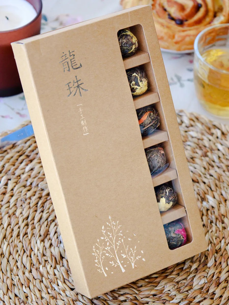Прессованные шарики из китайского чая с цветами в подарочном наборе. Презентабельная упаковка с красивым китайским узором.