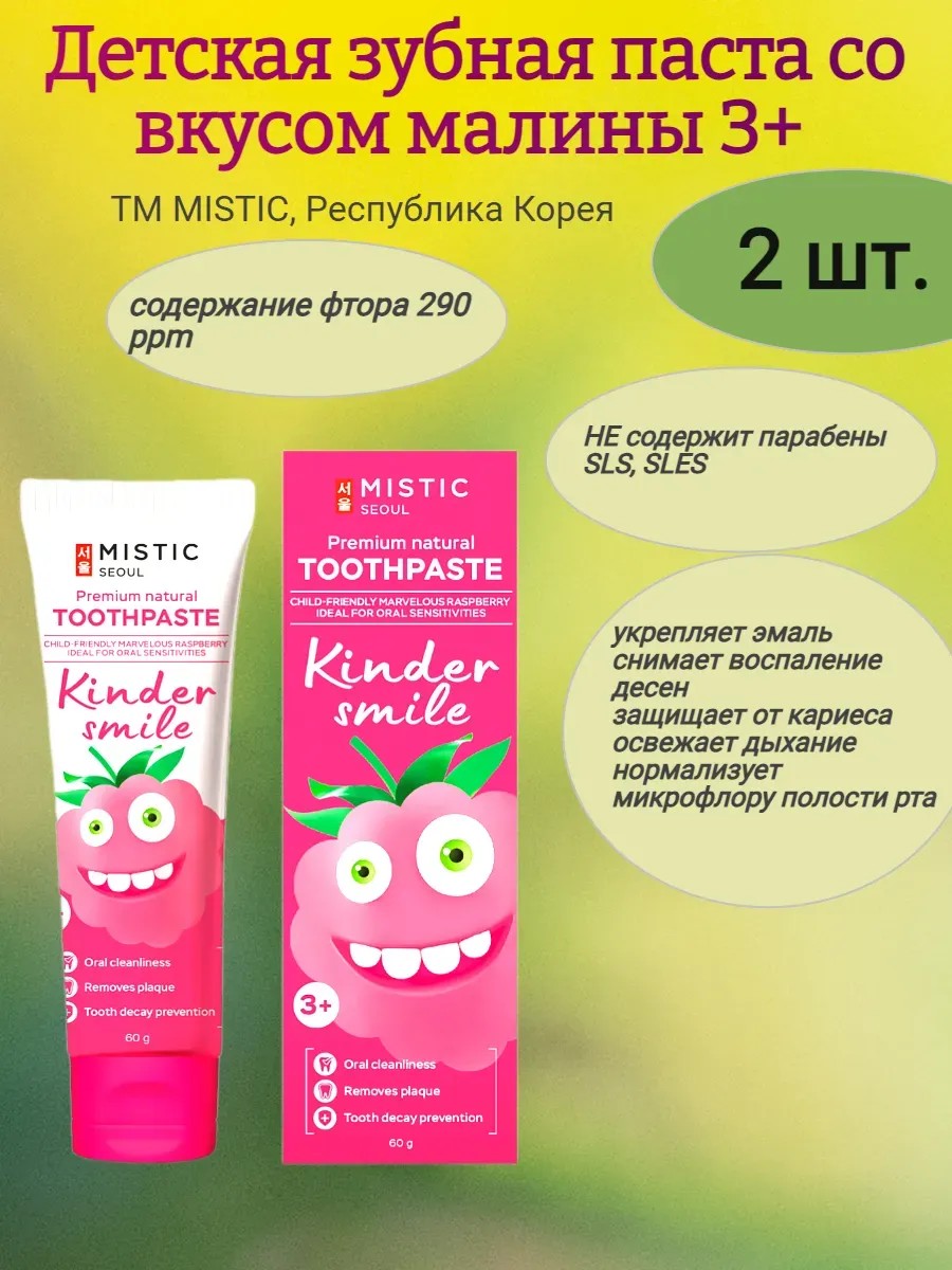 Natural children's premium toothpaste Kinder Smile Miracle Raspberry for sensitive mouth (3+), 60g. Mistic children's toothpaste with raspberry flavor and low fluoride content (290 ppm) is specially designed for sensitive teeth. The ingredients contained in the paste strengthen enamel, relieve gum inflammation and protect against caries. Xylitol normalizes oral microflora and has an antibacterial effect. The raspberry flavor promotes fresh breath and makes brushing teeth more pleasant. The formula is specially developed for children's use, which guarantees complete safety. Does not contain parabens, SLS, SLES. How to use: Apply a small amount of paste to the toothbrush. Brush your teeth 2-3 times a day for 2-3 minutes. Suitable for daily use. Intended for children from 3 years. Use strictly under adult supervision. Korean brands. Korean cosmetics. A gift for a child.