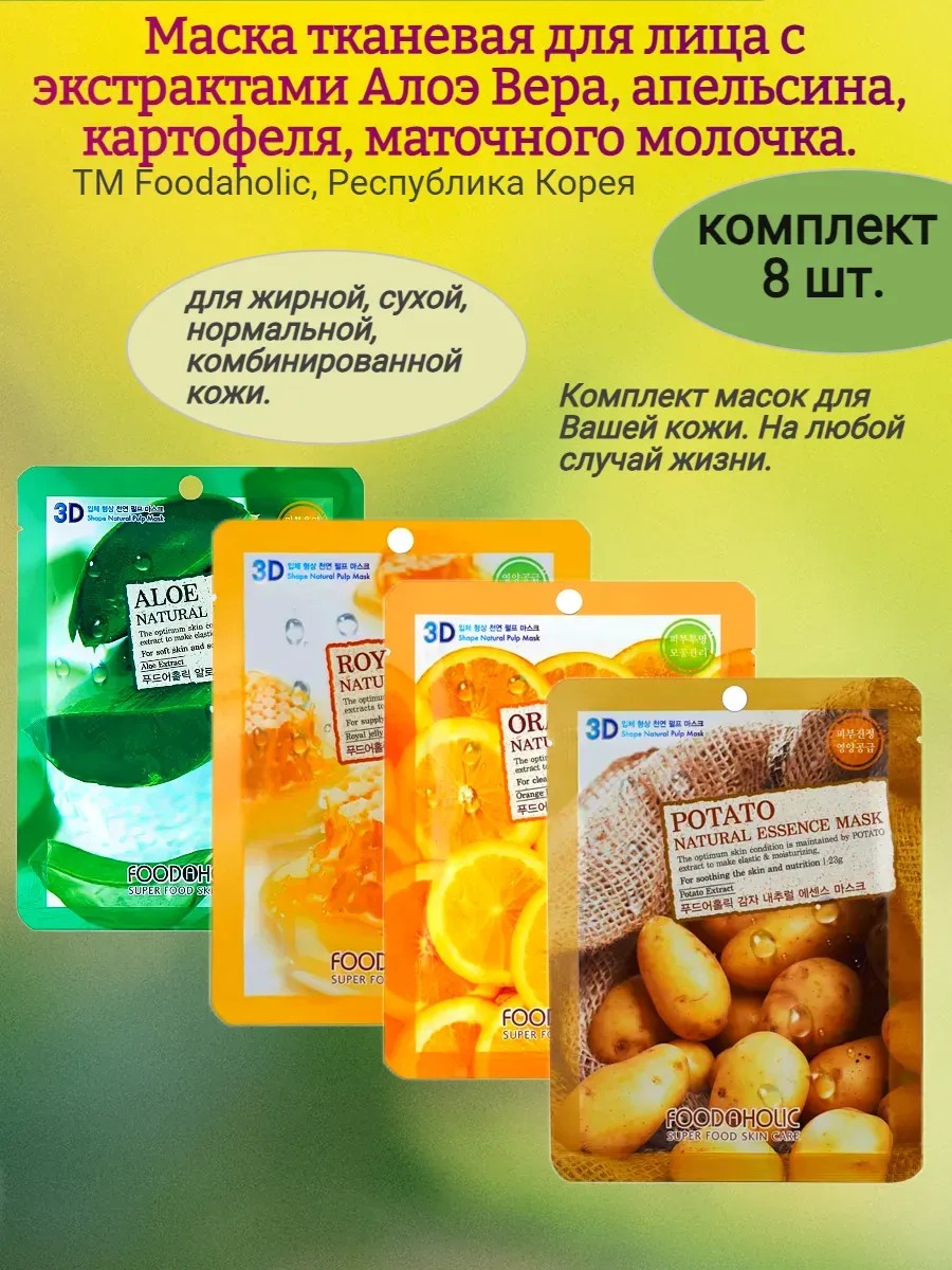Набор 3D масок для лица от Foodaholic. С экстрактами маточного молочка, картофеля, алоэ, апельсина. Маски хорошо питают и успокаивают кожу, помогают справиться с отеками, устранить воспаления и улучшить общее состояние лица. Хорошо смягчают огрубевшую кожу, помогают удалить ороговевшие клетки, устраняют отёки и следы усталости. Нормализуют обмен веществ, улучшают кровообращение, насыщают кожу влагой и питательными веществами. В отличие от обычных тканевых масок 3D маска от Foodaholic плотнее прилегает к коже лица, хорошо держится и не сползает. Нанести маску на очищенную кожу лица на 20-30 минут. Затем снять, а остатки средства распределить по коже до полного впитывания.