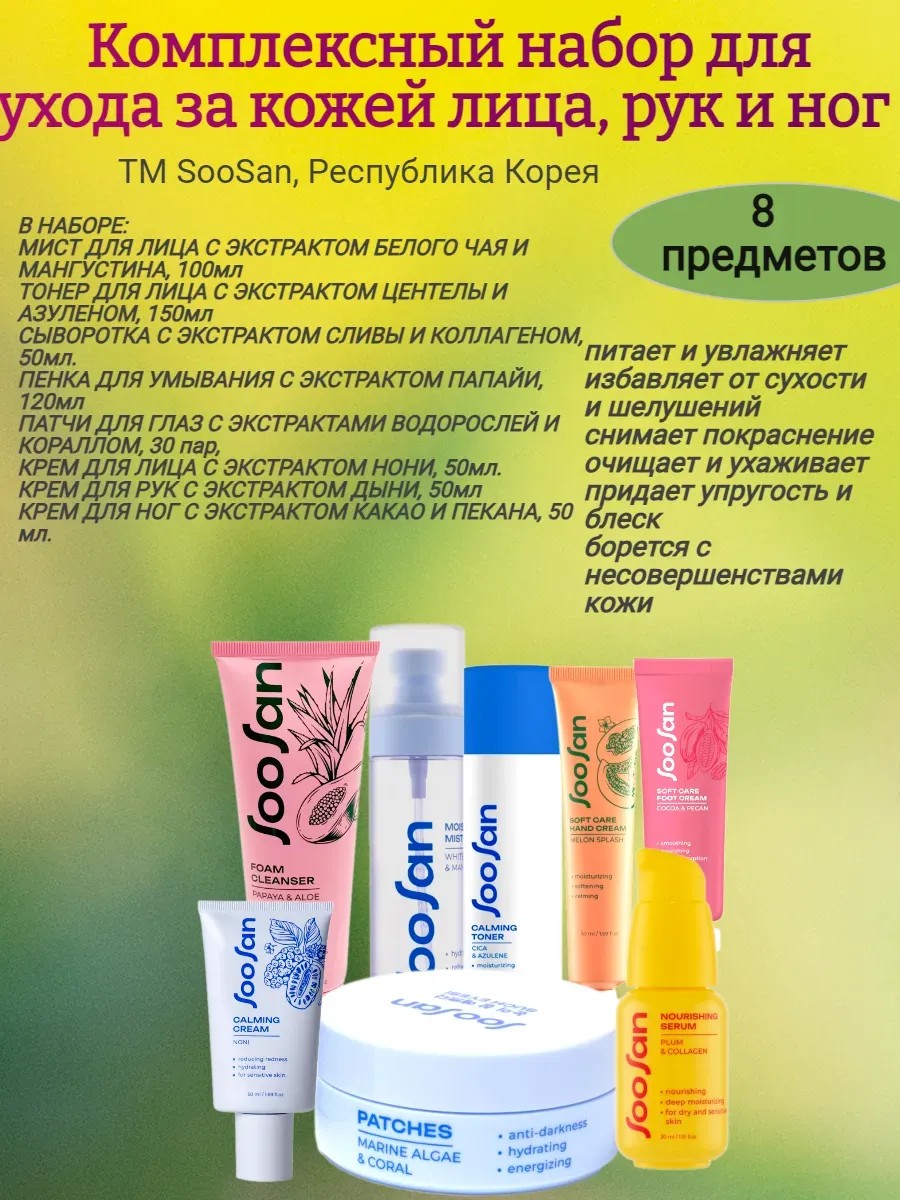 Комплексный набор для ухода за кожей лица, рук и ног. В набор входит 8 предметов: успокаивающий тонер с центелой и азуленом, увлажняющий мист для лица с экстрактами белого чая и мангустина, питательная сыворотка для лица с экстрактом сливы и коллагеном, очищающая пенка с экстрактом папайи и алоэ для чувствительной кожи, патчи для глаз от отеков и мешков с экстрактом морских водорослей и кораллом, крем для лица с экстрактом нони, крем для ног с экстрактами какао и пекана, крем для рук с экстрактом дыни, маслом жожоба и гиалуроновой кислотой. Данный набор предлагает точечные решения для увлажнения, себорегуляции, успокоения и антиоксидантной защиты, подходящие для разных типов кожи. Все предметы входящие в набор вулючают в себя натуральные экстракты фруктов, ягод, цветов которые помогают в борьбе с тусклым цветом лица, проблемной кожей, покраснениями, шелушением и другими несовершенствами. Благодаря использованию современных компонентов в рабочих концентрациях и дозировках, вся продукция обеспечивает видимые результаты и высокую эффективность ухода. А простота решений делает красоту естественной частью жизни каждой девушки и женщины. Кроме того, набор для ухода станет отличным подарком для мамы, подруги, жены. Подарите подарок на 8 марта или на Новый год. И женщина несомненно оценит Вашу заботу и внимание. Покупая набор для ухода за кожей вы подарите своей коже уход, свежесть, сияние и упругость.