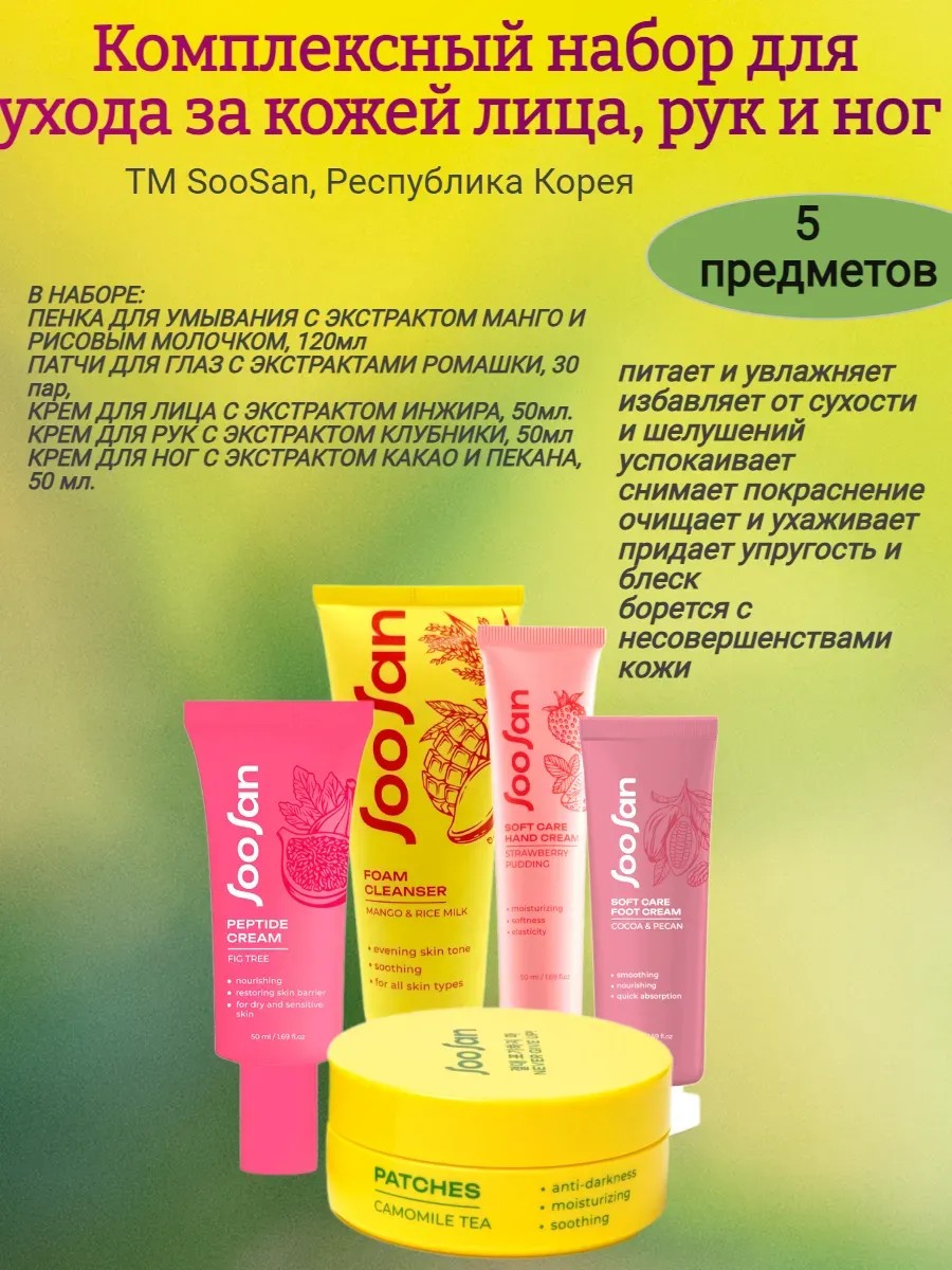 Набор для ухода за кожей лица, рук и ног. В набор входит 5 предметов: выравнивающая тон пенка с экстрактом манго и рисовым молочкой, патчи для глаз от отеков и мешков с экстрактами малины и питахайи, питательный крем для лица с экстрактом инжира и коллагеном, крем для ног с экстрактами какао и пекана, крем для рук с экстрактом клубники, маслом жожоба и гиалуроновой кислотой. Вся линейка содержит пантенол, который успокаивает кожу и снимает покраснения. Набор предлагает точечные решения для увлажнения, себорегуляции, успокоения и антиоксидантной защиты, подходящие для разных типов кожи. Все предметы входящие в набор вулючают в себя натуральные экстракты фруктов, ягод, цветов которые помогают в борьбе с тусклым цветом лица, проблемной кожей, покраснениями, шелушением и другими несовершенствами. Благодаря использованию современных компонентов в рабочих концентрациях и дозировках, вся продукция обеспечивает видимые результаты и высокую эффективность ухода. А простота решений делает красоту естественной частью жизни каждой девушки и женщины. Кроме того, набор для ухода станет отличным подарком для мамы, подруги, жены. Подарите подарок на 8 марта или на Новый год. И женщина несомненно оценит Вашу заботу и внимание. Покупая набор для ухода за кожей вы подарите своей коже уход, свежесть, сияние и упругость.
