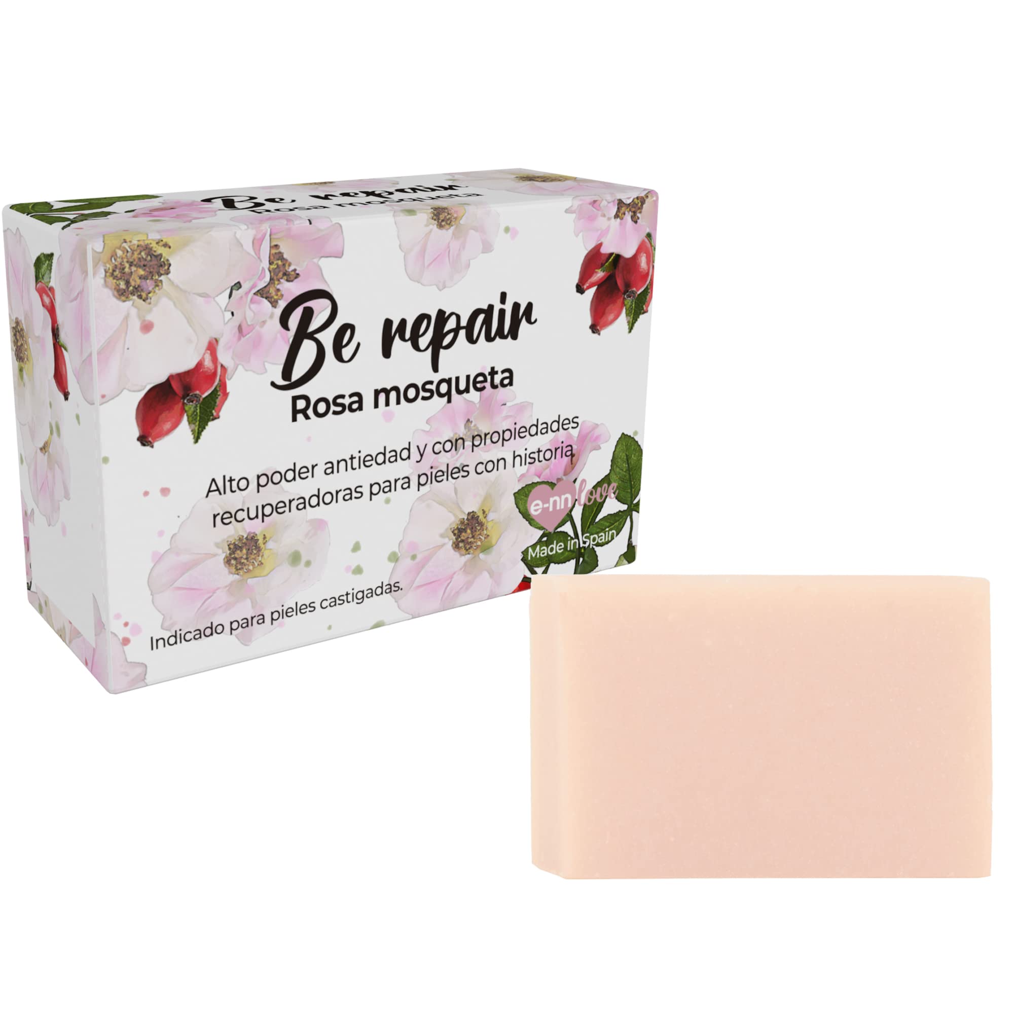 Be Repair Vegan Rosehip Soap is enriched with essential oils of lemon, lemongrass, lavender, and geranium. Rosehip has nourishing, repairing, and anti-aging properties. It helps heal the skin and regenerate collagen, making it ideal for blemish-prone skin that needs extra care. Suitable for normal to dry skin. It is made using a traditional, artisanal cold process saponification method. After a few days in the mold, the soaps are cut using a wire cutting system, making each bar unique. Ennlove soaps are made with coconut oil, which has moisturizing properties. It also balances the skin's pH, removes excess oil, and preserves collagen and elastin, giving the skin elasticity, suppleness, and radiance. Imagine a Sunday morning when you woke up without an alarm. The soothing scent of freshly hung clothes from the neighbors drifts in through the kitchen window. The fragrance of new opportunities envelops you as you brew a cup of tea that begins your story of calm, reset, and self-care. Directions: 1. Wet the soap tablet. 2. Rub the tablet with your hands until it lathers. 3. Massage the soap onto your skin. 4. Rinse the tablet and store it in a place free from standing water. Warnings: • For external use only • Avoid contact with eyes • Keep out of reach of children. • Do not use if skin irritation occurs. Ingredients: sodium cocoate, aqua, glycerin, parfum, muschata rose oil, tocopherol, hexyl cinnamal, citronellol, geraniol, linalool, eugenol.Suitable for normal to dry skin. Over 97 of the ingredients are of natural origin. Vegan, handcrafted soap made in Spain. Very sustainable: one 100g Ennlove bar is equivalent to two 250ml bottles of soap. Balances the skin's pH, removes excess oil, and preserves collagen and elastin, giving the skin elasticity, suppleness, and radiance. Helps heal the skin and regenerate collagen, making it ideal for blemish-prone skin that needs extra care. Solid cleanser with a repairing effect (Be Repair). Rosehip oil enriched with essential oils of lemon, lemongrass, lavender, and geranium. Highly regenerating and anti-aging properties for skin with a history of aging.E-NN LOVE Savon naturel végan Be Repair Rose musquée 97 d'origine naturelle avec haut pouvoir régénérateur et anti-âge 100 g Fabriqué en Espagne Nettoyant visage et corpsDESCRIPTION DU PRODUIT Le savon végan Be Repair à la rose musquée est enrichi en huiles essentielles de citron, citronnelle, lavande et géranium. La rose musquée a des propriétés nourrissantes, réparatrices et anti-âge. Aide à cicatriser la peau et à régénérer le collagène, ce qui en fait une peau à imperfections qui ont besoin de soins supplémentaires. Indiqué pour les peaux normales à tendance au dessèchement. Sa fabrication se fait par un processus traditionnel et artisanal de saponification à froid. Après quelques jours dans votre moule, les savons sont coupés à travers un système de fils, ce qui rend chaque portion de savon unique. Les savons Ennlove sont à base d'huile de coco qui a des propriétés hydratantes. En outre, il équilibre le pH de la peau, élimine les graisses et préserve le collagène et l'élastine, donnant à la peau de l'élasticité, de la souplesse et de l'éclat. Vous avez entre les mains un dimanche matin où vous vous êtes réveillé sans réveil. L'odeur adoucissante des vêtements fraîchement posés des voisins pénètre par la fenêtre de la cuisine. Le parfum de nouvelles opportunités vous enveloppe pendant que vous préparez un thé qui commence votre histoire de calme, de réinitialisation, de soins personnels. Mode d'emploi : Mouillez la pastille de savon. 2. Frottez la pastille avec vos mains jusqu'à faire mousser 3. Répartissez le savon sur votre peau en la massant 4. Rincez la pastille et conservez-la dans un endroit sans eau stagnante. Avertissements • Pour usage externe uniquement • Éviter tout contact avec les yeux • Tenir hors de portée des enfants. • Ne pas utiliser en cas d'irritation cutanée. Ingrédients : sodium cocoate, aqua, glycerin, parfum, huile de rose muschata, tocopherol, hexyl cinnamal, citronellol, géraniol, linalool, eugénol.Indiqué pour les peaux normales à tendance au dessèchement. Plus de 97 des ingrédients sont d'origine naturelle. Savon artisanal végétalien fabriqué en Espagne. Très durable : une pastille de 100 g d'Ennlove équivaut à deux bouteilles de savon de 250 ml. Équilibre le pH de la peau, élimine les graisses et préserve le collagène et l'élastine, donnant à la peau de l'élasticité, de la souplesse et de la luminosité. Aide à cicatriser la peau et à régénérer le collagène, ce qui en fait une peau à imperfections qui ont besoin de soins supplémentaires. Nettoyant solide avec effet réparateur (Be Repair). Rose musquée enrichie en huiles essentielles de citron, citronnelle, lavande et géranium. Haut pouvoir régénérant et aux propriétés anti-âge pour les peaux ayant une histoire.