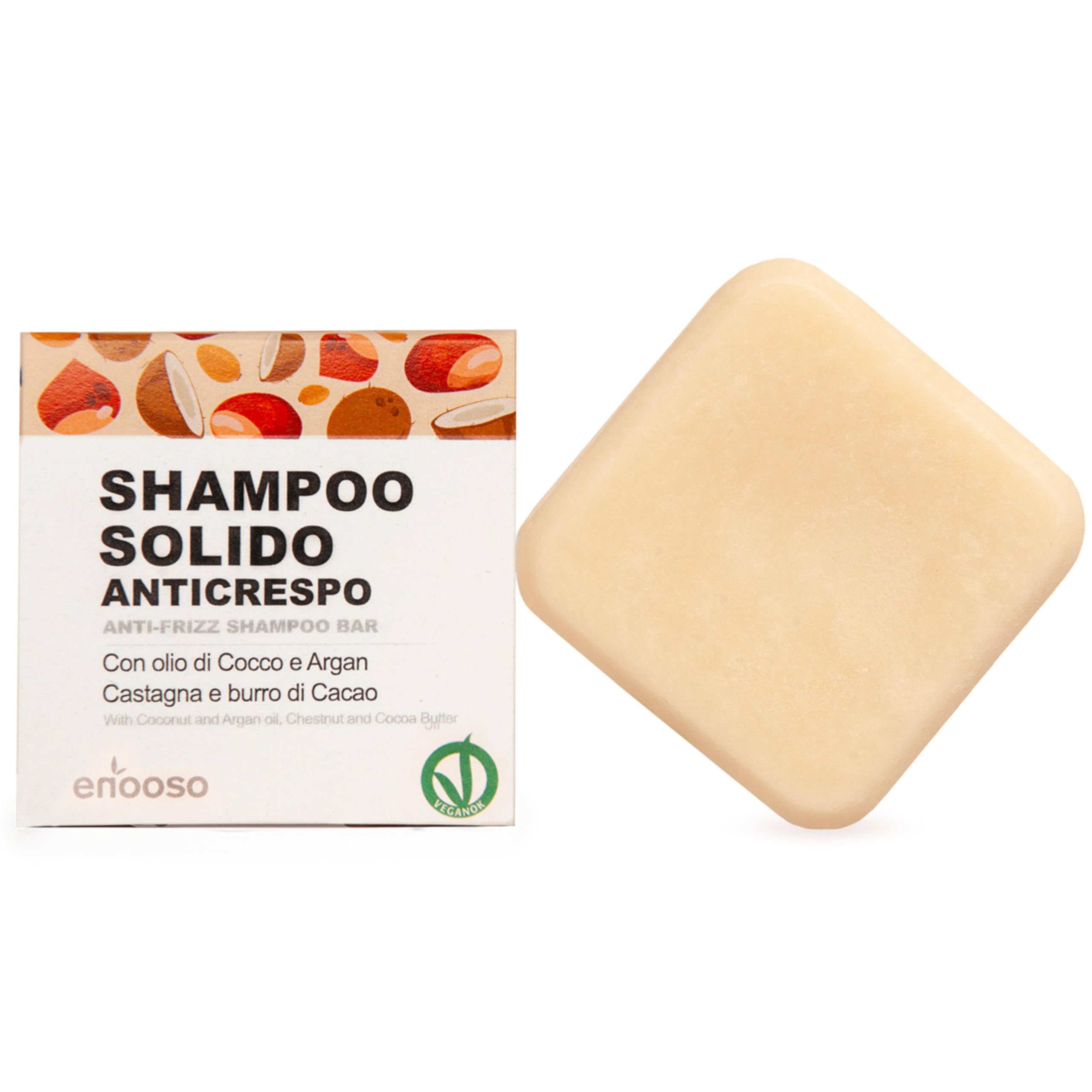 ? Convenient – Takes up little space in the shower or suitcase, there's no risk of spills, and travelers can take it everywhere. Plastic-free: Total commitment to the environment with this plastic-free anti-frizz shampoo. For our shampoos, we use paper packaging and biodegradable ingredients, choosing sustainable beauty. Ideal for all hair types: curly, Afro, delicate, and strong. Formulated in Italy with vitamin E and free of sulfates, parabens, and silicones to respect the hair's natural structure. Intense nourishment. Cruelty-free: The best blend of chestnut, coconut, argan, and cocoa butter oils intensely revitalizes and nourishes, promoting perfect curls and light, defined hair. Deep hydration: Exclusive combination of olive oil and cocoa butter for superior softness. Controls frizz, ideal for the curly hair method and for elastic and manageable hair.Shampooing solide bio pour cheveux bouclés - nourrissant avec huile d'argan et noix de coco, extrait de châtaigne et de noix - 100 artisanal biologique naturel végétalien - Fabriqué en Italie? Pratique – Prend peu de place dans la douche ou dans la valise, il n'y a pas de risque qu'il se gaspille en se renversant, et ceux qui voyagent peuvent l'emporter partout avec vous. Sans plastique : engagement total pour l'environnement avec le shampooing anti-frisottis sans plastique. Pour nos shampooings, nous utilisons des packs en papier et des ingrédients biodégradables, en choisissant une beauté durable. Idéal pour tous les types de cheveux bouclés, afro, délicats et robustes. Formulé en Italie avec de la vitamine E sans sulfates, parabènes ou silicones pour respecter la structure naturelle du cheveu. Nutriment intense Cruelty free : le meilleur mélange d'huiles de châtaigne, noix de coco, argan et beurre de cacao qui revitalise et nourrit intensément, favorisant des boucles parfaites et des poils légers et définis. Hydratation profonde : combinaison exclusive d'huile d'olive et de beurre de cacao pour une douceur supérieure. Domine les frisottis, idéal pour la méthode curly Hair et pour les cheveux élastiques et gérables.