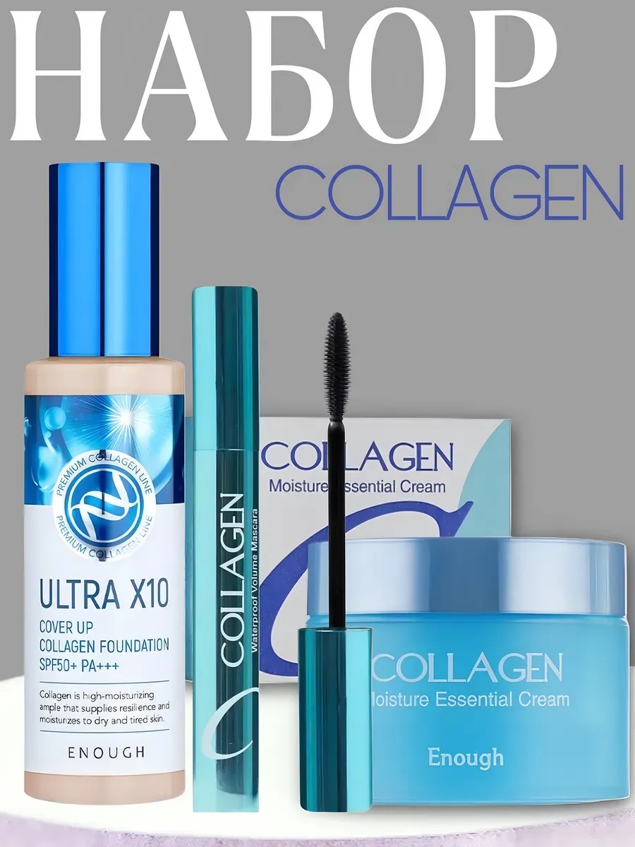 A gift set with decorative cosmetics for all skin types. The box contains: 1) ULTRA X 10 Matte Foundation - available in 2 shades (13, 21). Evens out skin tone, conceals imperfections, and adapts to your natural skin tone. Adapts to your skin tone. 2) Introducing the original Korean cream from ENOUGH with collagen (Collagen). This universal moisturizing and nourishing cream is suitable for all skin types, whether dry, oily, combination, or normal. 3) Collagen Mascara - waterproof, curls, lengthens, and adds volume to lashes. These products are suitable for daily use.