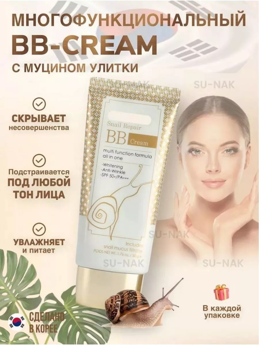 Snail Repair BB Cream with snail mucin provides comprehensive skin care. It moisturizes, softens, and protects against environmental aggressors, evens out skin tone and conceals imperfections. Contains snail mucin, one of the most popular ingredients in Korean cosmetics. It offers numerous beneficial properties, including hydration, nourishment, rejuvenation, brightening, and evens out skin tone. Snail mucin also has antibacterial properties and helps fight inflammation and acne. Additionally, this mattifying, light-toned BB cream contains a complex of plant extracts that strengthen, improve elasticity, and prevent the appearance of wrinkles. Magnolia extract moisturizes and promotes regeneration, honeysuckle extract has antioxidant properties, dogwood extract improves color and evens skin tone, and plantain extract soothes and softens. Adenosine is an effective anti-wrinkle ingredient that helps smooth wrinkles and prevent new ones. It also has anti-aging properties and restores elasticity. This professional foundation has a light, silky texture that spreads easily and absorbs quickly. It doesn't leave a greasy or sticky feeling and doesn't clog pores. Suitable for all skin types, including oily and problematic skin. This professional Korean foundation is an excellent choice for those seeking a comprehensive skincare product and wanting an even tone and healthy complexion. Directions: Apply the desired amount and distribute evenly using a special sponge, brush, or your fingertips. For a more even coverage, wait a few minutes for it to absorb. Then, continue applying makeup.