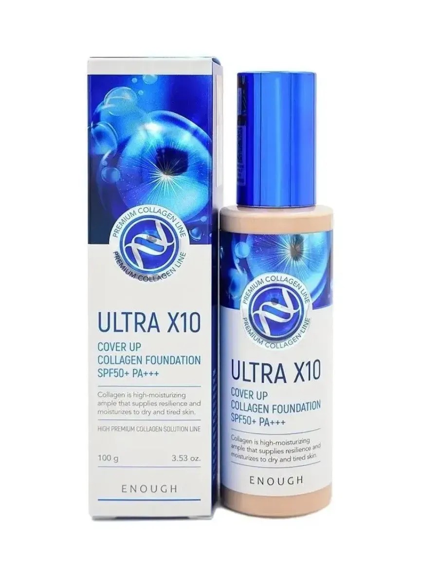 Корейский оригинал!Тональный крем Collagen Foundation Cover Up Ultra X10 от Enough с защитой от солнца spf 50 для лица для безупречного макияжа. Увлажняющий крем для лица Корея с легким покрытием скрывает несовершенства, постакне, покраснения от прыщей. Корейская основа под макияж выравнивает цвет лица, придаёт сияние и свежесть. Коллаген делает кожу упругой и эластичной. 2 оттенка: тон № 13 светло бежевый, светлый. Тон № 21 бежевый. Наносите тональник на хорошо увлаженную кожу, чтобы тоналка ложилась тонким ровным слоем. Тональная основа подходит для всего типов кожи женщин: для жирной кожи, сухой, чувствительной, комбинированной и проблемной кожи лица. Обеспечит плотное матовое покрытие. Стойкий, и при этом легкий профессиональный крем без эффекта маски, как у вв крема. Тональное средство имеет матирующий эффект и степень защиты спф 50.