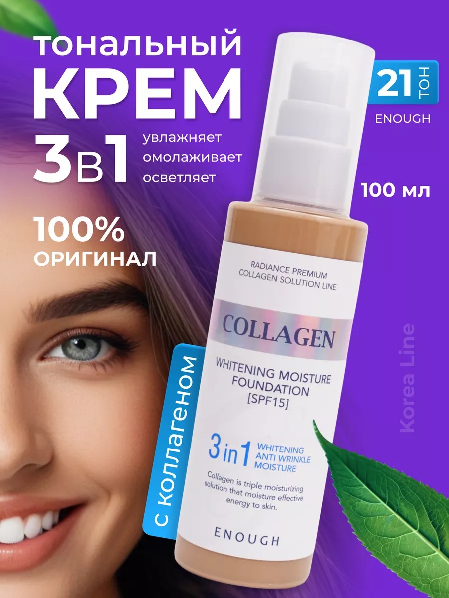 Увлажняющий тональный омолаживающий солнцезащитный крем с коллагеном 3 в 1 Enough Collagen whitening foundation обеспечивает защиту от солнца spf 15. Прекрасно ложится на кожу, увлажняет и питает её. Увлажнение, антивозрастной эффект, отбеливание - 3 свойства в одном флаконе. Основа помогает скрыть любые несовершенства кожи, такие как следы от прыщей, покраснений и пигментации. Защитный с spf является также антивозрастной. Он не плотный и обладает легким покрытием, при этом стойкий. Не сушит кожу и придает лицу здоровое сияние. Коллаген разгладит структуру кожи и выровняет тон. Экстракт центеллы азиатской окажет противовоспалительное и ранозаживляющее действие. Тональное средство с спф представлено в двух оттенках: светлый тон №13 слоновая кость и цвет №21 бежевый. Применение: нанести на увлаженную кожу. Благодаря этому тоналка ложится тонким ровным слоем и не забивает поры. Выравнивающий и защитный помогает не только скрыть несовершенства кожи, но и оказывает лифтинг эффект. Используя крем можно добиться как эффекта сияние, так и матовый финиш макияжа. Тонирующий и матирующий крем корейский подходит как для сухой, чувствительной и нормальной кожи, так и для жирной, комбинированной, проблемной и возрастной кожи. Профессиональная косметика для лица - ваш уход за лицом. Оригинальная корейская косметика уходовая из Кореи для женщин. Чтобы проверить подлинность, отсканируйте QR штрихкод на упаковке. Сияй и обновляйся вместе с брендом Korea Line. Знакомьтесь с другими уникальными продуктами по уходу за кожей в нашем магазине, нажмите на название бренда Korea Line под ценой товара - и переходите в Каталог товаров. Вдохновленные заботой о каждой из Вас. Приятных покупок.