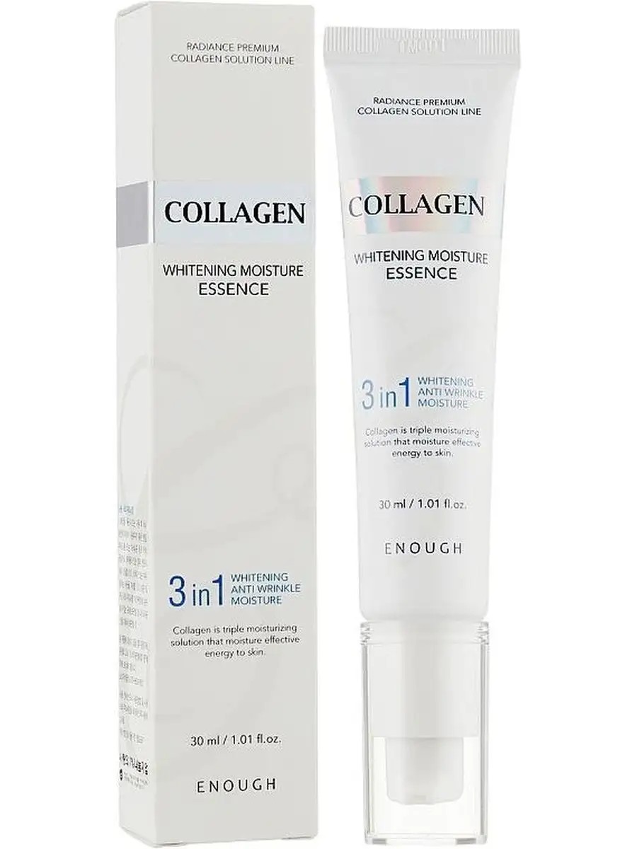 Осветляющая эссенция для области вокруг глаз с коллагеном Collagen Whitening Moisture Essence 3 in 1 южнокорейского бренда Enough также включает ниацинамид в качестве основного компонента. Невесомая текстура легко наносится, мгновенно впитывается полностью, сразу оказывает комплексное воздействие. Средство укрепляет, подтягивает, разглаживает и восстанавливает структуру кожи, активизирует выработку коллагена и эластина, препятствует обвисанию и сухости, повышает упругость и эластичность кожного покрова. Эссенция сокращает количество и глубину морщин, насыщает питательными веществами влагой, надолго сохраняет кожу увлажнённой. Она также обеспечивает антиоксидантную защиту и предохраняет от влияния ультрафиолета. Продукт можно использовать в качестве базы под макияж.