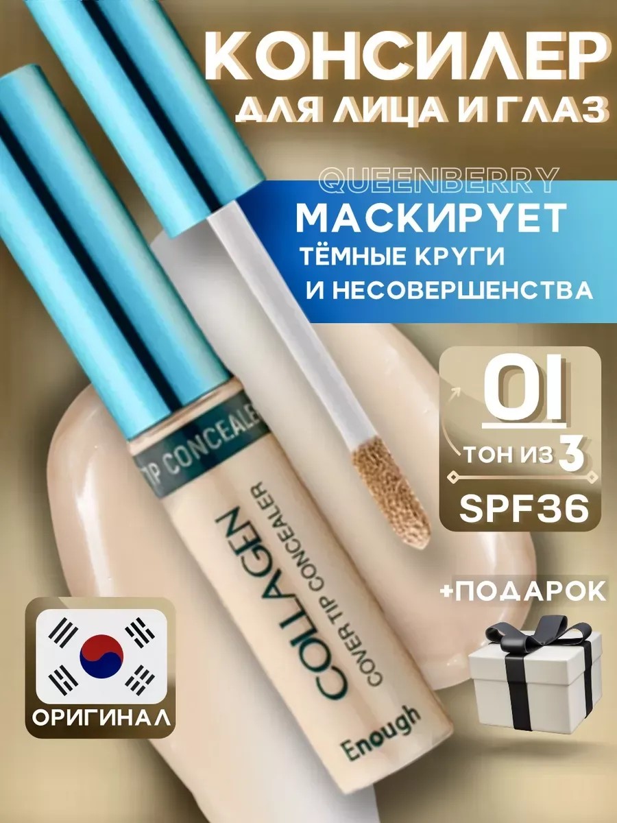 The Collagen Cover Tip Concealer, a moisturizing concealer for eyes and face, from Enough is an original Korean makeup line for your beauty! This concealing beauty product with a corrective effect evens out skin tone, concealing redness and blemishes. It contains collagen and SPF 36+++. Thanks to these ingredients, this creamy concealer has a caring effect, moisturizing and protecting the skin from the sun. This long-lasting tint with a convenient brush has an anti-inflammatory effect and is suitable for the delicate skin around the eyes. Available in shades 01 (dark beige), 02 (ivory), and 03 (light beige). It's a great choice for concealing age spots, scars, post-acne marks, blemishes, redness, unevenness, and pigmentation before applying makeup. This product helps achieve a natural, breakout-free glow. This lightweight cream provides full coverage, and its natural shades are suitable for a variety of skin types. The brush makes it easy to precisely apply the concealer to imperfections. It helps conceal redness on the eyelids, as well as bags and dark circles under the eyes. It moisturizes women's skin and smoothes fine lines. This concealer from the Korean brand ENOUGH is suitable for both everyday and professional makeup. It's a universal choice for various skin types, including oily, dry, problematic, and combination skin. It can be used as a base and under eye makeup. It evens out skin tone and spreads easily without creasing on the eyelids. It's a must-have for your makeup bag. This moisturizing concealer makes a great gift for the New Year holidays, birthdays, or March 8th. It will easily become part of your everyday beauty kit! Choose Collagen from Korea for fresh and radiant skin! Professional cosmetics – your facial care. Original Korean facial cosmetics, beware of counterfeits!