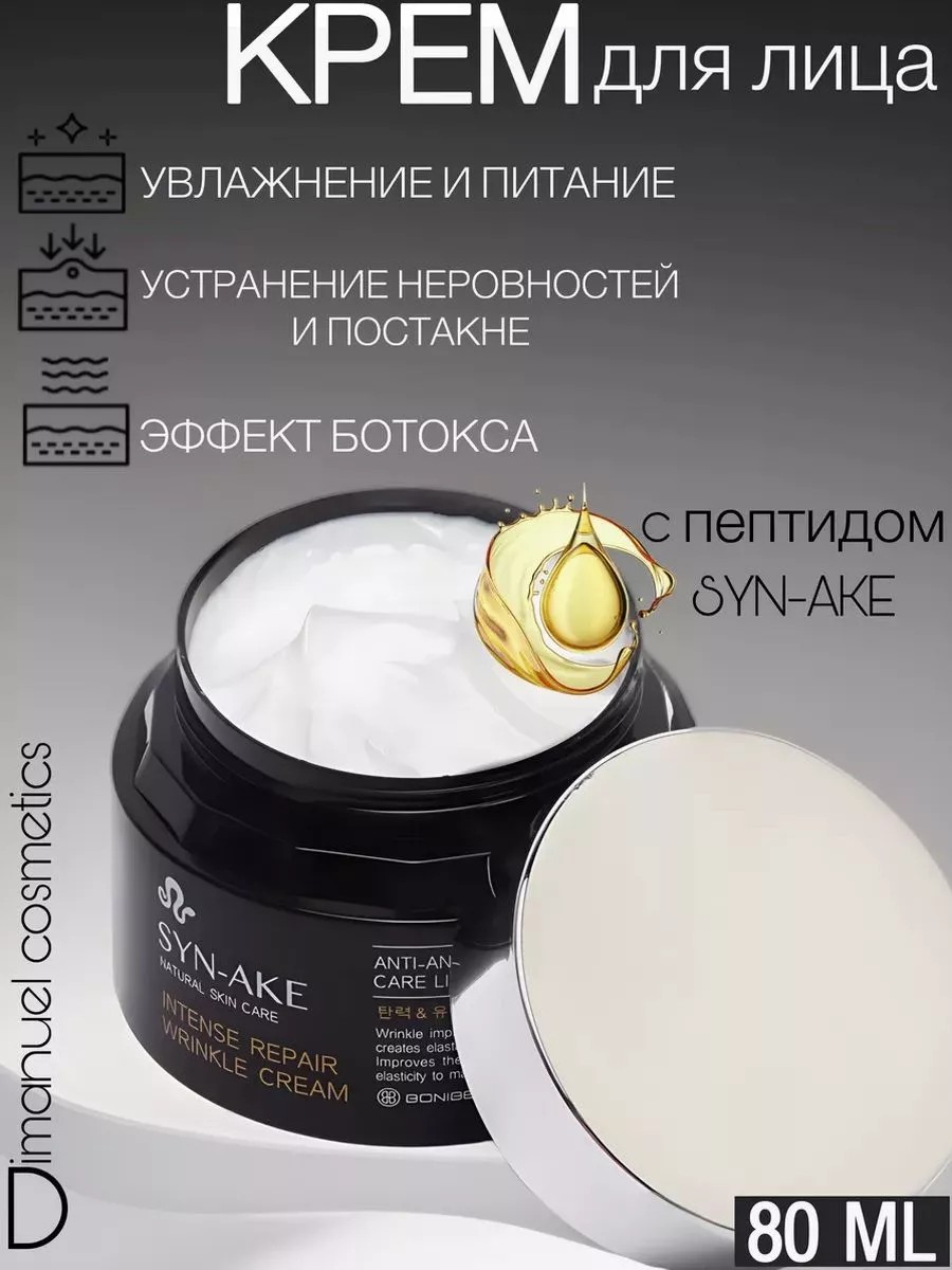 An anti-aging face cream with snake venom peptide. Effective for mature and tired-looking skin. Refreshes, hydrates, and evens out skin texture. It absorbs instantly, is safe, hypoallergenic, and leaves no stickiness. The main ingredient is the Syn-ake peptide, a synthetic analogue of viper venom, which instantly relaxes muscles, eliminating wrinkles and unevenness. Snake venom peptide is a substance that mimics the action of natural viper venom. It is used in cosmetology to improve the appearance of skin. The peptide's unique ability to instantly relax muscles enables its anti-aging effect: it eliminates wrinkles, improves skin texture, and evens out facial contours. "Snake Peptide" from a Korean brand is a face cream of superior quality and effectiveness, based on natural ingredients. It is the best choice for you. Enough Bonibell Syn-Ake Intense Repair Wrinkle Cream is a face cream with the following characteristics: light consistency; deeply nourishes and moisturizes; improves skin firmness and elasticity; firms and tones skin; eliminates redness and irritation; leaves skin soft and fresh. Directions: Apply a small amount of cream to the face with light massage movements before bed, wait until completely absorbed.