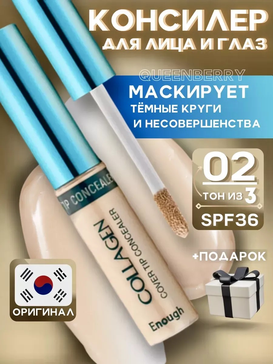 The Collagen Cover Tip Concealer, a moisturizing concealer for eyes and face, from Enough is an original Korean makeup product for your beauty! This concealing beauty product with a corrective effect evens out skin tone, concealing redness and blemishes. It contains collagen and SPF 36+++. Thanks to these ingredients, this creamy concealer has a caring effect, moisturizing and protecting the skin from the sun. This long-lasting tint with a convenient brush has an anti-inflammatory effect and is suitable for the delicate skin around the eyes. It is an excellent choice for concealing age spots, scars, post-acne marks, blemishes, redness, unevenness, and pigmentation before applying makeup. This cosmetic helps achieve a natural, breakout-free glow. Available in shades 01 (dark beige), 02 (ivory), and 03 (light beige). This lightweight cream provides full coverage, and the natural shades are suitable for a variety of skin tones. The brush makes it easy to precisely apply the concealer to imperfections. It helps conceal redness on the eyelids, as well as bags and dark circles under the eyes. It moisturizes women's skin and smoothes fine wrinkles. This concealer from the Korean brand ENOUGH is suitable for both everyday and professional makeup. It's a universal choice for various skin types, including oily, dry, problematic, and combination. It can be used as a base or under eye makeup. It evens out skin tone and spreads easily without creasing on the eyelids. It's a must-have in your makeup bag. This moisturizing concealer is a great gift for the New Year holidays, birthdays, and Women's Day. It will easily become part of your daily beauty kit! Choose Korean Collagen for fresh and radiant skin! Professional cosmetics – your facial care. Original Korean facial cosmetics, beware of counterfeits!