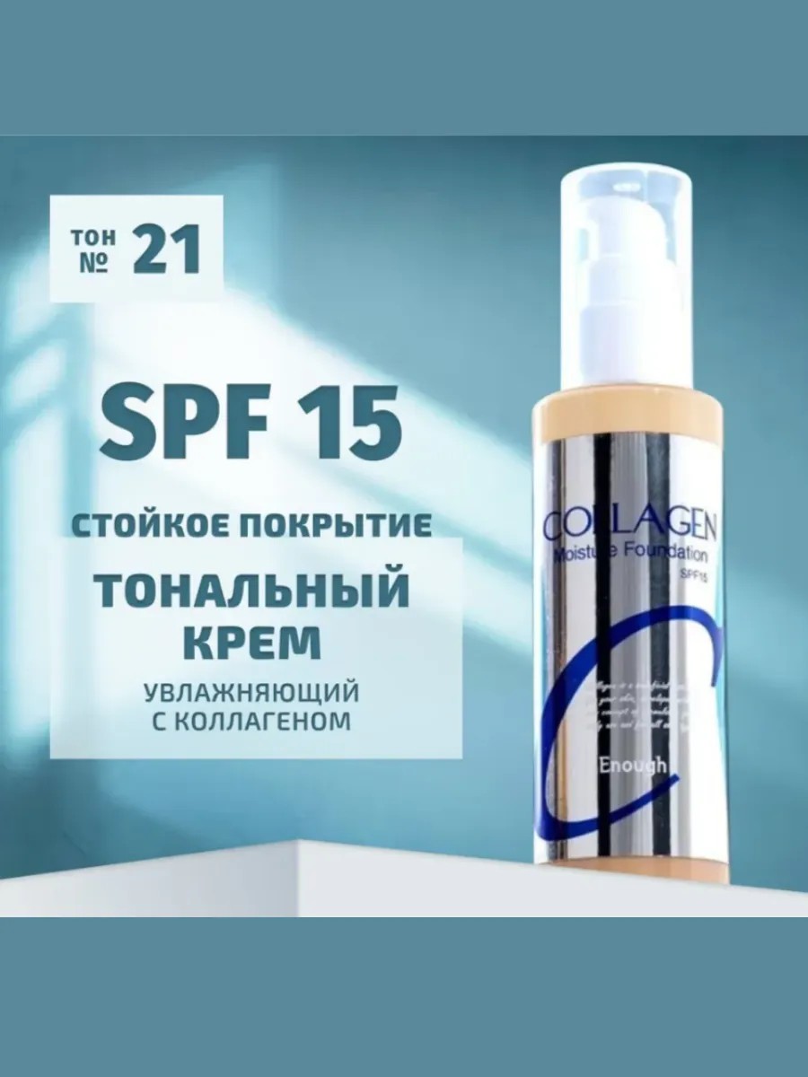 Увлажняющий тональный крем с коллагеном Enough Collagen Moisture Foundation тон 21 обладает легким покрытием, не сушит кожу и придает лицу здоровое сияние. Средство помогает скрыть несовершенства.Основные компоненты: Коллаген - улучшает общее состояние кожи, разглаживает и выравнивает ее, делает упругой и эластичной, убирает мелкие морщинки и освежает. Корейский тональный крем Enough обладает ранозаживляющим и успокаивающим действием, удерживает влагу в глубоких слоях кожи. Экстракт центеллы азиатской - обладает противовоспалительным действием, способствует восстановлению барьерных свойств кожи, уменьшает отеки. Для хорошего и ровного покрытия наносите на хорошо увлаженную кожу (после крема, базы под макияж, праймера).