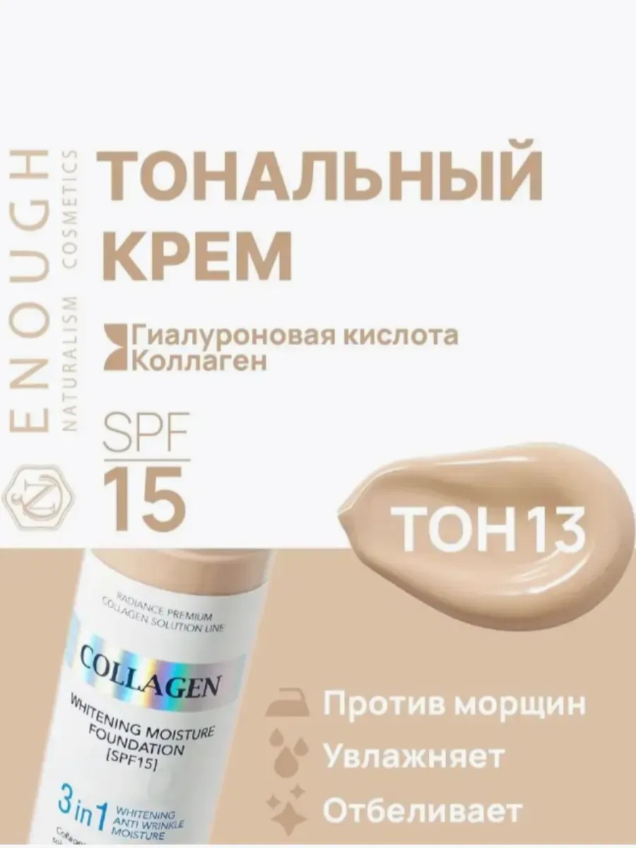 Тональный крем для лица с коллагеном от ENOUGH - это идеальное решение для тех, кто стремится к улучшению внешнего вида кожи. Этот уникальный продукт сочетает в себе отбеливающие и увлажняющие свойства, обеспечивая матовый оттенок и защиту от пигментации. СPF 15+ защищает кожу от вредного воздействия солнечных лучей, делая его незаменимым в любое время года. Текстура кремовая обеспечивает легкое и быстрое впитывание, подходя для всех типов кожи, включая комбинированную и нормальную. Состав, обогащенный коллагеном, способствует улучшению эластичности и упругости кожи, делая ее более здоровой и свежей. Выбирая тональный крем от ENOUGH, вы выбираете качественный и эффективный продукт для достижения идеального состояния кожи.