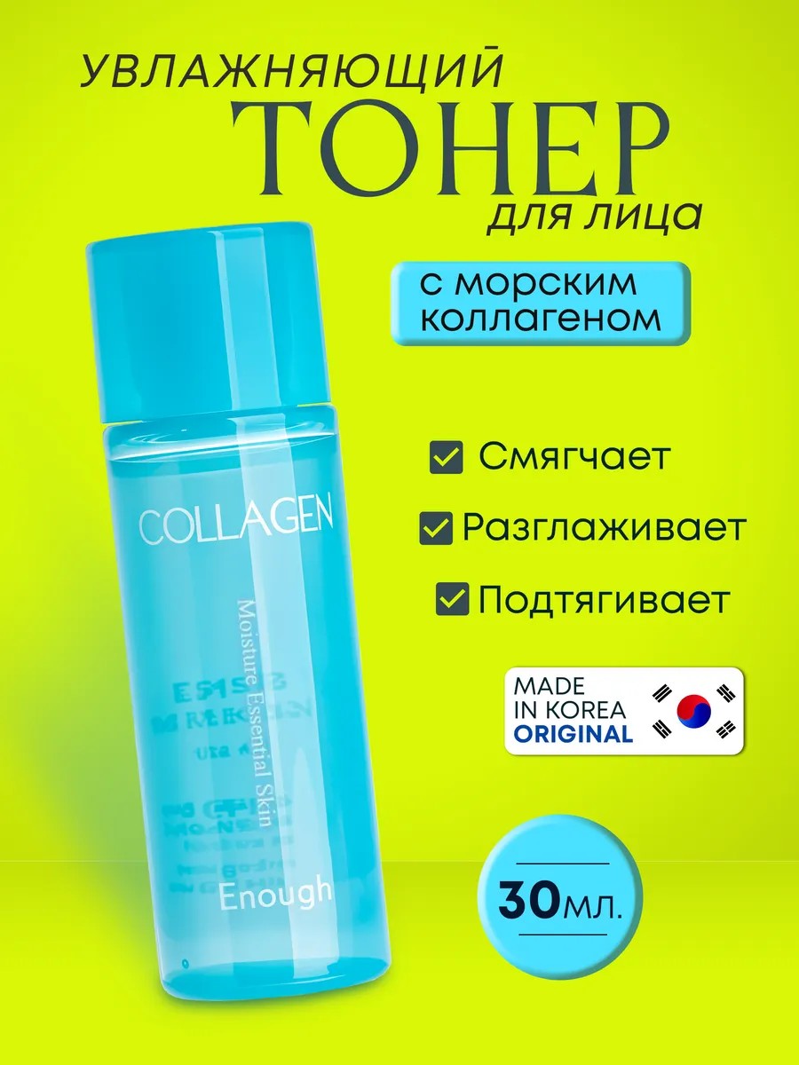 ENOUGH Увлажняющий тонер для лица ваш секрет молодости и свежести. Тоник мгновенно укрепляет, увлажняет, быстро впитывается, наполняет её влагой, осветляет, смягчает, не оставляя ощущения сухости и стягивания. Тоник для лица это эффективное косметическое средство, для увлажнения и снижения пигментации кожи. Тоник для лица увлажняющий специально разработанный для ухода за сухой, зрелой, нормальной и комбинированной кожи. Тонер помогает улучшить общее состояние кожи. Благодаря уникальной формуле, тоник для лица корея уменьшает видимость мелких морщин и пятен. Увлажняющий тоник ENOUGH прекрасное дополнение к вашему ежедневному уходу за кожей. Корейская косметика является одним из первопроходцев в области гипоаллергенных средств для кожи. Тонер для лица содержит только натуральные ингредиенты, которые увлажняют, питают и защищают кожу. Коллаген морской, разглаживает, подтягивает кожу, ниацинамид осветляет пигментацию, выравнивает тон, оберегает от агрессивного воздействия внешних факторов, обновляет клетки и ткани, напитывает их ценными микроэлементами, дарит мягкость и эластичность. Корейская косметика для лица интенсивный дневной уход за кожей лица, декольте, шеи, рук, также защищает от провисания и потери четких контуров лица, препятствует появлению новых морщин. Collagen enough тонер универсальное решение для полного ухода за кожей. Тонер для лица корея легко впитывается, не оставляет жирного блеска. Тонер для лица увлажняющий идеальная база под макияж. Корейский тонер, увлажняющий для лица, содержит витамины и минералы. Компактная упаковка тоника не занимает много места в вашей косметичке. Миниатюру удобно взять с собой в самолёт, на работу, в бассейн. Коллагеновый тоник успокаивает и снимает раздражение и воспаления. Преимущества: Против пигментации Увлажнение Для всех зон. В составе естественные ингредиенты. Не оставляет жирного блеска. Без ощущения сухости и стягивания. Удобная и компактная упаковка.