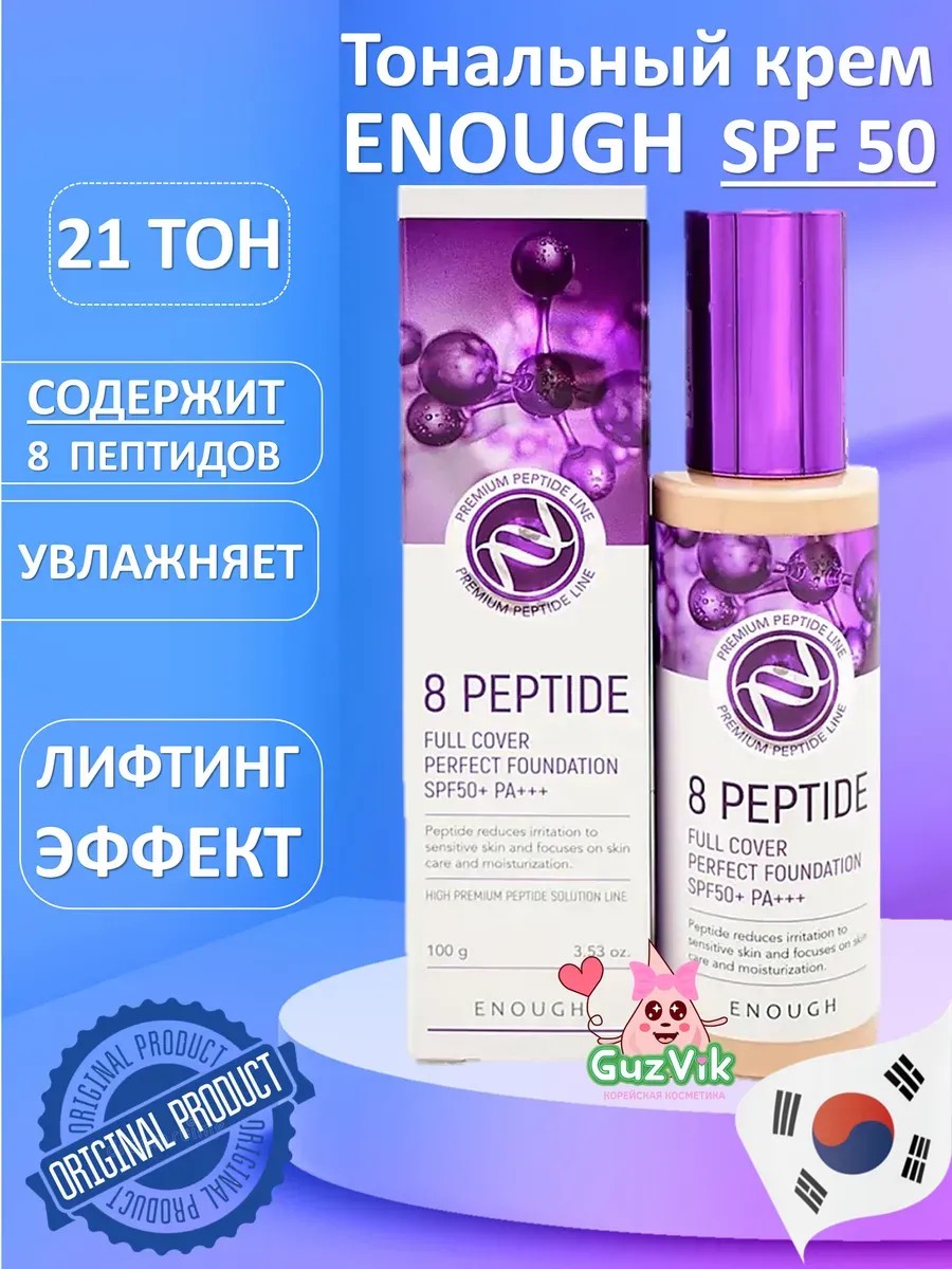 Тональная основа 8 PEPTIDE FULL COVER PERFECT SPF 50+ PA+++, Тон 21 от корейского производителя позволяет создать идеальное покрытие и замаскировать мелкие текстурные и цветовые несовершенства. 8 пептидов повышают плотность кожи, стимулируют выработку гиалуроновой кислоты, выравнивают рельеф, разглаживая морщины. Крем для лица тональный Тон 21 имеет лёгкую флюидную текстуру, растягивается по коже и не создаёт эффекта маски. Он практически сразу схватывается на коже и быстро усаживается, не подчёркивая поры. Средство для лица обеспечивает стойкое покрытие и не плывёт на коже, склонной к повышенной жирности. Тональный крем для лица 8 пептидов не создаёт трудностей с растушёвкой и не формирует резких границ. Средство создаёт красивый сатиновый финиш, добавляя лицу объём в нужных местах и создавая эффект здоровой кожи. Натуральные компоненты тонального крема № 21 творят чудеса даже с самой проблемной кожей. Он в линейке по интенсивности второй из трёх (№ 13- светло-бежевый, № 21- натуральный бежевый, № 23 – темно-бежевый). Закончить контуринг лица по Т-зоне рекомендуем пудрой chanel тон 06, арт.267611546, или посветлее - тон 05, арт. 266760463