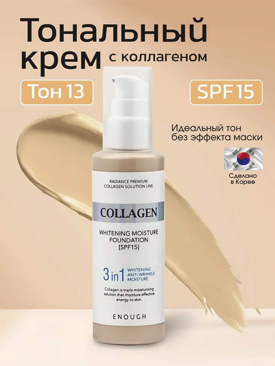 Увлажняющий тональный крем с коллагеном 3 в 1 Enough Collagen whitening foundation тон № 13 имеет защиту от солнца spf 15. Прекрасно ложится на кожу, увлажняет и питает её. Увлажнение и антивозрастной эффект- 2 свойства в одном флаконе. Тональное средство ложится без эффекта маски, легкое покрытие, но при этом плотный и стойкий. Коллаген разгладит структуру кожи и выровняет тон. Экстракт центеллы азиатской окажет противовоспалительное и ранозаживляющее действие.