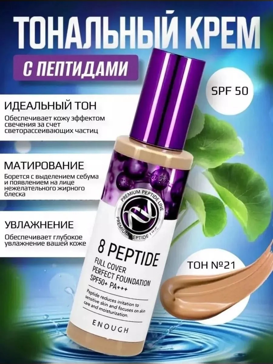 Корейская косметика для макияжа - тональная основа 8 peptide корейского бренда Enough - Увлажняющий корейский тональный крем с пептидами 13 тон и высоком фактором защиты от солнца уф защита 50++ выравнивает цвет лица, маскирует воспаления, придает лицу свежий вид. Тональная основа энаф с пептидами увлажняет кожу, выравнивает тон, рельеф, маскирует видимые недостатки кожи. Благодаря пептидному комплексу тональный с спф обладает восстанавливающим и омолаживающим эффектом, повышает общий тонус, подтягивает и ускоряет регенерирующие процессы кожи. Матовый матирующий с spf 50 +++ для лица Корея так же контролируют образование меланина и предотвращают появление пигментации. Наносите тональник 8 пептид на хорошо увлаженную кожу, чтобы крем тональный для лица ложился тонким ровным слоем. Профессиональный уход за кожей для женщин. 8 пептид энаф с коллагеном подходит круглогодично и отлично подходит как защита кожи летом. Также, скрывает следы постакне и пигментные пятна и является отличным подарком женщине.
