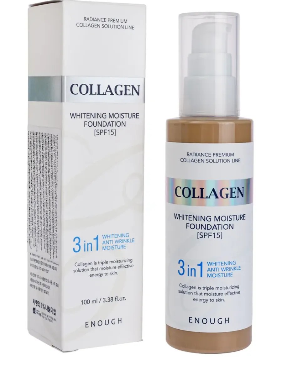 Тональный крем с коллагеном 3 в 1 Enough Collagen whitening foundation обеспечивает защиту от солнца spf 15. Коллагеновый крем Enough обладает лифтинг-действием, он снимает отечность, укрепляет кожные ткани и подтягивает контур лица, предотвращая дряблость и увядание кожи.Прекрасно ложится на кожу, увлажняет и питает её.