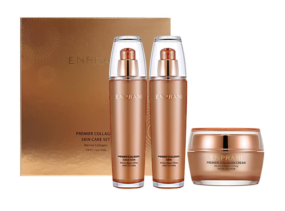 CONTAINS: 1 ENPRANI PREMIER COLLAGEN SKIN 125 ML 1 ENPRANI PREMIER COLLAGEN EMULSION 125 ML 1 ENPRANI PREMIER COLLAGEN CREAM 50 ML DESCRIPTION: ENPRANI PREMIER COLLAGEN MARINE COLLAGEN AND ADENOSINE WRINKLE CARE CONTAIN ABUNDANT INGREDIENTS TO GIVE SKIN ELASTICITY AND TRANSFORM THE SKIN TO MOISTURIZED HEALTHY SKIN. ENPRANI PREMIER COLLAGEN SKIN 125ML 4.22FL.OZ. COLLAGEN SKIN THAT MOISTURIZES DRY SKIN AND SMOOTHES SKIN TEXTURE. [HOW TO USE] AFTER CLEANSING, TAKE AN APPROPRIATE AMOUNT AND APPLY EVENLY. [MAIN INGREDIENT] ADENOSINE [ALL INGREDIENTS] WATER, GLYCERIN, BETAINE, MODIFIED ALCOHOL, GLYCERIN-26, BUTYLENE GLYCOL, 1,2-HEXANEDIOL, HYDROLYZED COLLAGEN, SODIUM HYALURONATE, WILD YAM ROOT EXTRACT, ATELOCOLLAGEN, IMPERATA CYLINDRICA ROOT EXTRACT, DISODIUM ADENOSINE TRIPHOSPHATE, TOCOPHERYL ACETATE, PALMITOYL PENTAPEPTIDE-4, BIS-PEG-P18 METHYL ETHEREAL DIMETHYLSILANE, PEG-60 HYDROGENATED CASTOR OIL, CARBOMER, TROMETHAMINE XANTHAN GUM, CARAMEL, POLYSORBATE 20, HEXYLDECANOL, ALGIN SODIUM CITRATE, PEG-8, ADENOSINE, DISODIUM ETHANE, ETHYL ETHYLHEXYLGLYCERIN, FRAGRANCE ENPRANI PREMIER COLLAGEN EMULSION 125ML 4.22FL.OZ. COLLAGEN EMULSION THAT PROVIDES VITALITY AND ELASTICITY TO THE SKIN WITH RICH NUTRITION AND MOISTURE. [HOW TO USE] AFTER USING THE SKIN, TAKE AN APPROPRIATE AMOUNT AND GENTLY APPLY EVENLY ON THE SKIN. [MAIN INGREDIENT] ADENOSINE [ALL COMPONENTS] WATER, GLYCERIN, CYCLOPENTASILOXANE, BETAINE, HYDROGENATED POLYISOBUTENE, BUTYLENE GLYCOL DICAPRYLATE DICAPRATE, BUTYLENE GLYCOL, 1,2-NUCLEIC ACID DIOL, HYDROLYZED COLLAGEN, SODIUM HYALURONATE, WILD YAM ROOT EXTRACT, ATELOCOLLAGEN, IMPERATA CYLINDRICA ROOT EXTRACT, DISODIUM ADENOSINE TRIPHOSPHATE, TOCOPHERYL ACETATE, PALMITOYL PENTAPEPTIDE-4. ARACHIDYL ALCOHOL, BEHENYL ALCOHOL, ARACHIDYL GLUCOSIDE, GLYCERYL STEARATE, PEG-100 STEARATE, BUTYL ALCOHOL, STEARIC ACID, CAPRYLIC CAPRIC TRIGLYCERIDE, LECITHIN, SORBITAN STAY RATE. DIMETHICONE, CETEARYL ISONONANOATE, CETEARETH-20, CETEARETH-12, CETYL PALMITATE, BENZOIC ACID, BEESWAX, CETEARYL ALCOHOL, HYDROXYETHYL ACRYLATE SODIUM ACRYLOYL DIMETHYL TAURATE COPOLYMER, SQUALANE, POLYSORBATE 60, SORBITAN ISOSTEARATE, CARBOMER, TROMETHAMINE, ETHYLSILYL GLYCERIN, ADENOSINE, GINTAN GUM, DISODIUM ETHANE, POLYSORBATE 20, HEXYLDECANOL, ALGIN, SODIUM CITRATE, PEG-8, YELLOW NO. 4, YELLOW NO. 5, FRAGRANCE ENPRANI PREMIER COLLAGEN CREAM 50ML 1.69FL.OZ. COLLAGEN CREAM THAT MOISTURIZES THE SKIN AND GIVES SKIN ELASTICITY. [HOW TO USE] USE AS THE LAST STEP OF SKINCARE. TAKE AN APPROPRIATE AMOUNT AND APPLY EVENLY OVER THE FACE AND LET IT ABSORB GENTLY. [MAIN INGREDIENT] ADENOSINE [ALL INGREDIENTS] WATER, CYCLOPENTASILOXANE, BUTYLENE GLYCOL, GLYCERIN, BETAINE, GLYCERYL MONOSTEARATE, HYDROGENATED POLYDECENE, 1,2-NUCLEIC ACID DIOL, METHYLGLUCOSESES QUINATERATE, COCONUT OIL, ALOE VERA LEAF EXTRACT, CETEARYL ALCOHOL, DIMETHICONE, PEG-60 HYDROGENATED CASTOR OIL, NUCLEDECANOL, WILD YAM ROOT EXTRACT, HYDROLYZED COLLAGEN, CYCLONUCLEISILOXANE, PEG- PPG-19 19 DIMETHICONE, DIMETHICONE VINYL MATCH CONE CROSSPOLYMER, CARBOMER, POLYETHYLENE, PEG- PPG-20 15, PHENYLMETHICONE, TROMETHAMINE, ADENOSINE, SODIUM HYALURONATE, GLYCERYL POLYMETHACRYLATE, ALLERGIC ACID, YEAST EXTRACT, GLYCOPROTEIN, DISODIUM ETHANE, POLYSORBATE 20, PALMITOYL PENTAPEPTIDE-4, ALGIN, SODIUM CITRATE, ATELOCOLLAGEN, DISODIUM ADENOSINE TRIPHOSPHATE, IMPERATA CYLINDRICA ROOT EXTRACT, PEG-8, ETHYL GLYCERIN, FRAGRANCE, YELLOW NO. 4, YELLOW NO. 5Made in Korea. CONTAINS: 1 Enprani Premier Collagen Skin 125 ml, 1 Enprani Premier Collagen Emulsion 125 ml, 1 Enprani Premier Collagen Cream 50 ml. ENPRANI Premier Collagen Cream 50ml 1.69fl.oz. - Collagen cream that moisturizes the skin and gives skin elasticity. [How to use] Use as the last step of skincare. Take an appropriate amount and apply evenly over the face and let it absorb gently. ENPRANI Premier Collagen Emulsion 125ml 4.22fl.oz. - Collagen emulsion that provides vitality and elasticity to the skin with rich nutrition and moisture. [How to use] After using the skin, take an appropriate amount and gently apply evenly on the skin. ENPRANI Premier Collagen Skin 125ml 4.22fl.oz. - Collagen skin that moisturizes dry skin and smoothes skin texture. [How to use] After cleansing, take an appropriate amount and apply evenly. Enprani Premier Collagen Marine Collagen and Adenosine Wrinkle Care contain abundant ingredients to give skin elasticity and transform the skin to moisturized healthy skin.