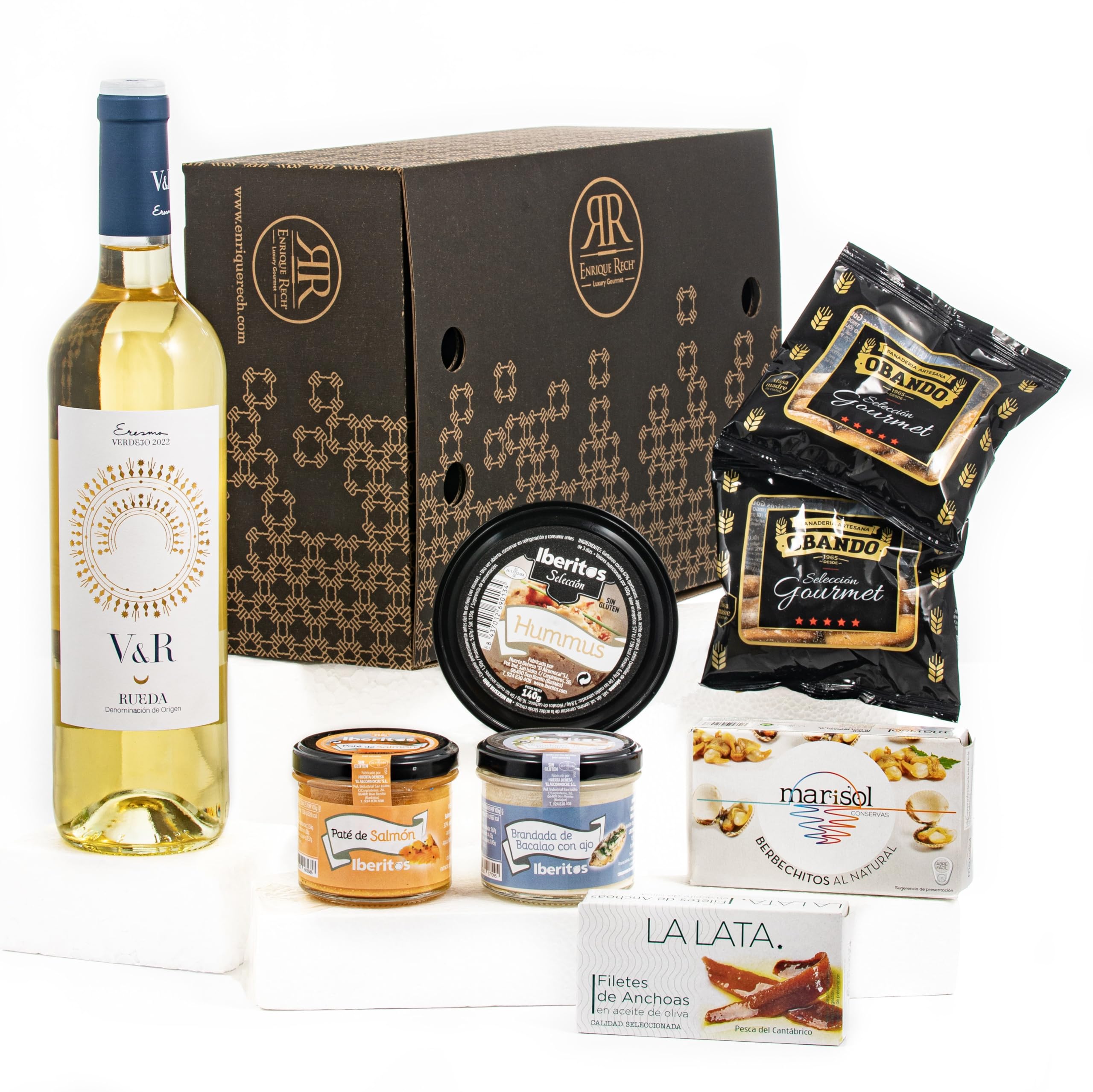ENRIQUE RECH - Geschenkkorb - Verdejo V R Weißwein - Kabeljau-Brandadepastete - Lachspastete - Kichererbsen-Hummus - Berberechitos Marisol - Sardellen und Picos Artesanos - Präsentkorb