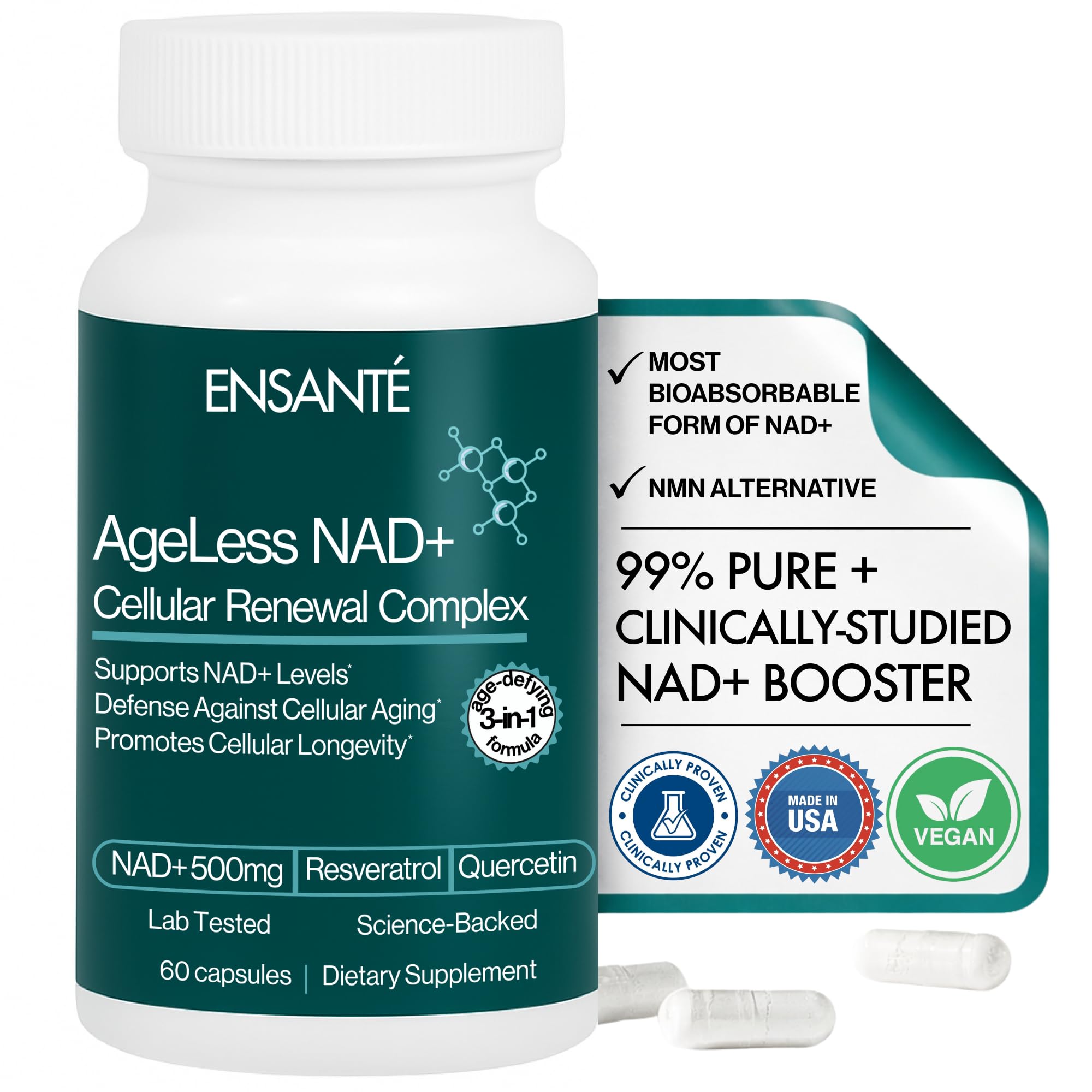 60 VEGETARIAN CAPSULES SMART ALTERNATIVE TO TRENDING LONGEVITY PRODUCTS: Ideal for those exploring nad supplements for women, nad supplements for women, nad supplements for men, or nr supplements alternatives to trending categories such as nmn supplement, nmnh, liposomal, peptides, bpc 157 peptide, nad peptide, anti aging liposomal nad science, and more. Safe to consume and easy to use without using the need for injectable peptides or unapproved ingredients. SCIENCE-BACKED, BIOACTIVE ANTIOXIDANTS: Designed to emulate the science-forward approach of top longevity formulas, our NAD resveratrol supplement uses proven actives like nicotinamide, resveratrol, quercetin, and lipoic acid—nutrients known for supporting brain health, cellular vitality, and antioxidant defense. A smart choice for users comparing resveratrol NAD, nmn resveratrol, or nr supplement options. QUALITY APPROVED, TRIPLE LAB TESTED MADE IN USA: Crafted with veggie capsules and high-quality ingredients, this NAD advanced formula is triple lab tested for purity and produced in a GMP-certified facility in the USA. A premium choice for shoppers seeking and NAD supplements for women, or NAD supplements for men. Vegan, plant-based vegetarian capsules, NON-GMO, and free from additives for purity, potency, and quality you can trust. SUPPORTS OVERALL BRAIN HEALTH: Promotes natural cognitive health, for brain supplement support, brain supplements for energy and focus benefits, and healthy cellular renewal. Ideal for those seeking an energy and focus supplement, longevity supplement, neuropathy supplements, or neuro and brain energy supplements to help elevate everyday performance. Designed to support cellular repair pathways, mitochondrial health, and overall longevity - ideal for those prioritizing longevity and wellness from the inside out. ADVANCED NAD RESVERATROL WELLNESS FORMULA FOR ANTI AGING, CELLULAR RENEWAL ENERGY SUPPORT: Our Advanced NAD Resveratrol supplement features a premium wellness formula delivering 500mg NAD with resveratrol, quercetin, and nicotinamide riboside to support natural energy, healthy cellular renewal, and cognitive function. Ideal for shoppers seeking NAD resveratrol, NAD plus, NAD advanced, anti aging support, brain supplement, focus supplement, neuro wellness, brain health, or energy supplements that promote overall natural energy boosts, focus support, vitality and longevity. A smart nr alternative to trending nmn supplement, nmnh, anti aging supplement, and similar longevity blends. HIGH POTENCY, BIOAVAILABLE NAD SUPPLEMENT WITH NICOTINAMIDE RIBOSIDE, RESVERATROL QUERCETIN: Delivers a hefty NAD 500mg featuring nicotinamide riboside chloroside, trans resveratrol quercetin. Our premium, science-backed NAD formula is designed to restore natural NAD levels tp boost mitochondrial function and fuel clean, sustained energy. Feel sharper, more focused, and more resilient with a powerful combination that supports cognitive performance, cellular health, and overall well-being. Perfect for anyone looking for a high-purity NMN or NAD precursor or NAD booster, or high quality solution for long-term healthy aging and total body vitality.