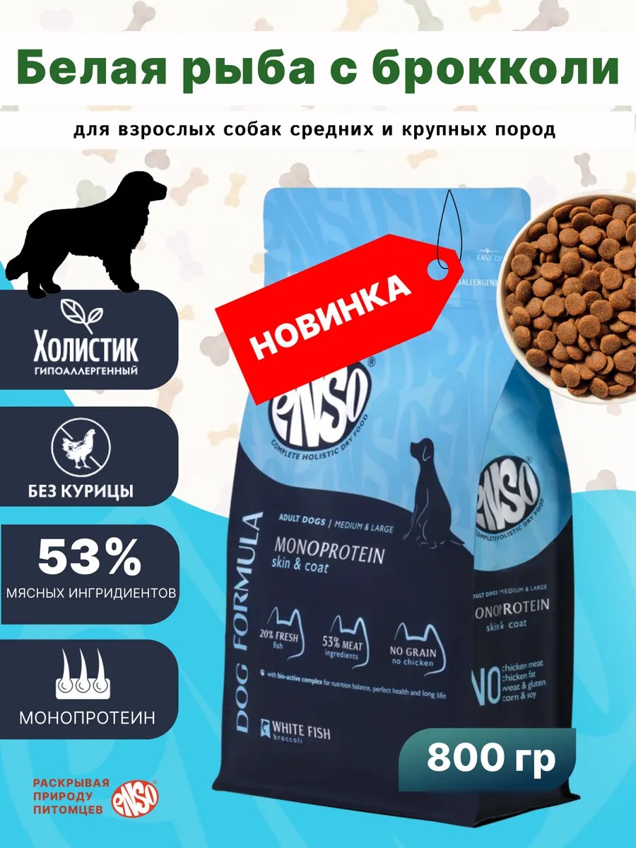| Полное наименование товара | ENSO Dog formula Monoprotein сухой полнорационный корм для взрослых собак средних и крупных пород со свежей белой рыб добавлением брокколи 0,8 кг |