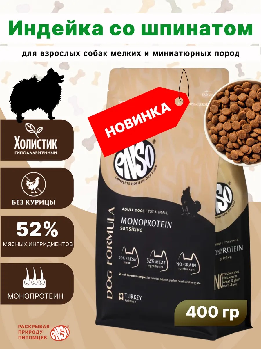 | Полное наименование товара | ENSO Dog formula Monoprotein сухой полнорационный корм для взрослых собак мелких и миниатюрных пород со свежей индейка добавлением шпината 0,4 кг |