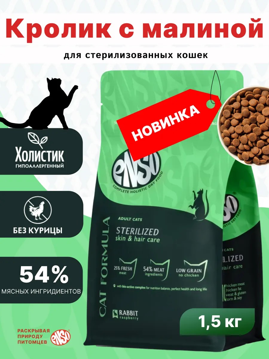 | Полное наименование товара | ENSO Cat formula Sterilized сухой полнорационный корм для стерилизованных кошек со свежим кролик добавлением малины 1.5 кг |