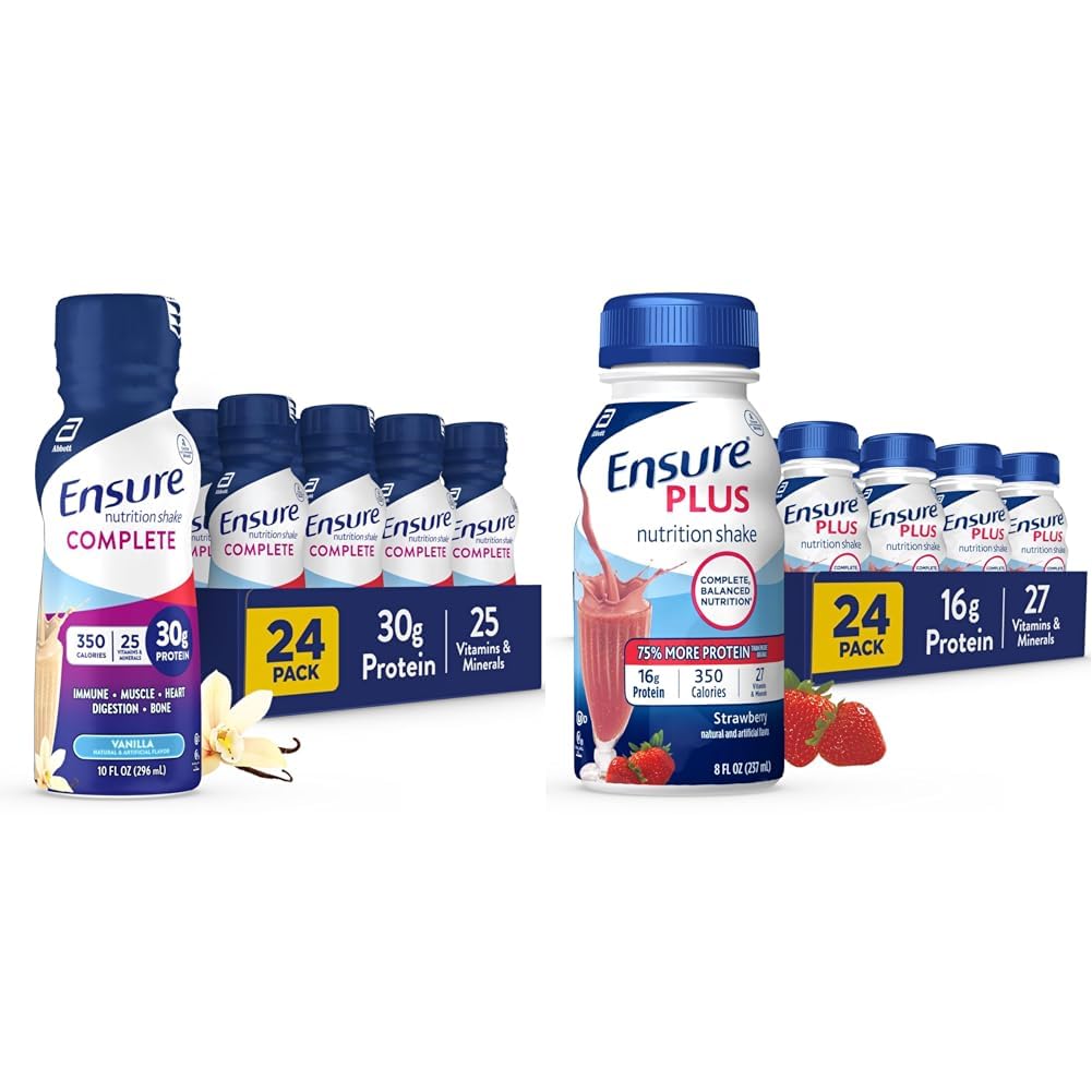 This bundle includes Ensure COMPLETE and Ensure Plus nutritional shakes to support your health goals. The Ensure COMPLETE shake provides complete, balanced nutrition with 30 grams of high-quality protein to support muscles and 350 calories per serving. It also contains zinc, Vitamin A, and antioxidants Vitamins C and E to support immune health. The Ensure Plus shake is clinically proven to help gain or maintain a healthy weight, with 350 calories and 16 grams of protein per serving. Like Ensure COMPLETE, it also has zinc, Vitamin A, antioxidants, and 27 essential vitamins and minerals to support the immune system, muscles, heart, and bones. Together, these two Ensure shakes complement each other to provide a comprehensive spectrum of nutritional support. The Ensure COMPLETE shake offers more protein to help build and maintain muscle mass, while the Ensure Plus shake provides more calories to help gain or maintain weight. Both contain a similar vitamin and mineral profile to support overall health and immune function. Enjoy the delicious vanilla flavor of Ensure COMPLETE and strawberry flavor of Ensure Plus as nutritious meals or snacks throughout your day.