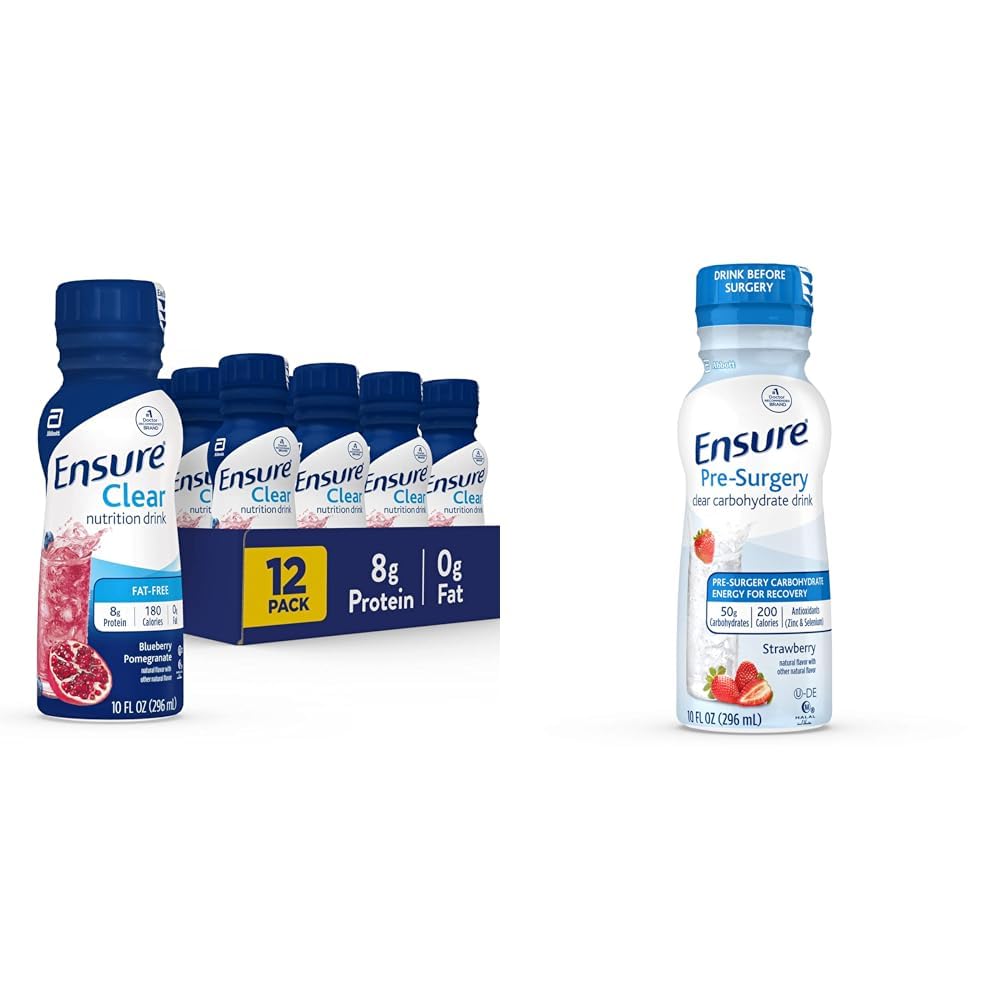 Ensure Liquid Clear Nutrition Drink, 0g fat, 8g of protein, Blueberry Pomegranate, 10 Fl Oz (Pack of 12), Bottle, gluten free From the 1 doctor-recommended brand, Ensure Clear Nutrition Drink provides daily nutrition with 15 vitamins and minerals, 8g protein, and 0g of fat. It's a tasty way to help fill your nutrition gaps. Ensure Pre-Surgery, Clear Carbohydrate Drink, Strawberry, 10 Fl Oz (Pack of 4) Ensure Pre-Surgery, Clear Carbohydrate Drink, Strawberry, 10 fl oz, 4 Count.