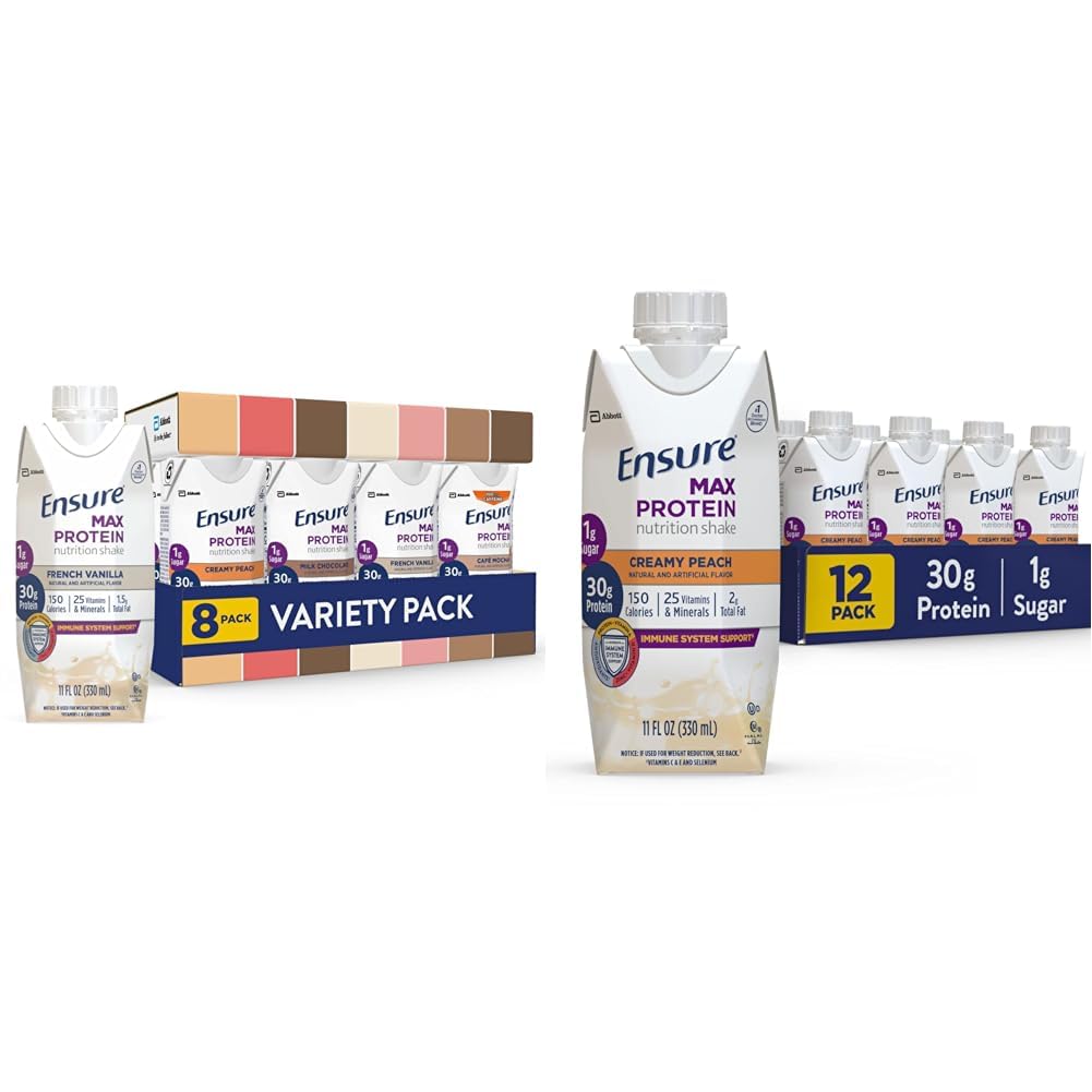 Ensure Max Protein Nutrition Shakes, Variety Pack, With 30g of Protein, 1g of Sugar, Nutrients to Support Immune System Health, High Protein Shake, 11 fl oz, Pack of 8, Liquid Ensure Max Protein variety pack lets you taste all 7 delicious flavors to find your favorites: Milk Chocolate with caffeine, Café Mocha, Milk Chocolate, Creamy Strawberry, Creamy Peach, Cherry Cheesecake, and French Vanilla. Each flavor in this shake variety pack has 30g of high-quality protein to help keep muscles strong and satisfy hunger. Ensure Max Protein also has 1g of sugar, 150 calories, plus 25 essential vitamins and minerals, including vitamins A and D, zinc, and antioxidants (vitamins C E and selenium) to support immune health. From Ensure, the 1 doctor-recommended brand. This product is gluten-free and suitable for lactose intolerance.† Among doctors who recommend liquid nutritional products to their patients. † Not for people with galactosemia. Ensure Max Protein Nutrition Shake Liquid, with 30g of Protein, 1g of Sugar, High Protein Shake, Creamy Peach, 11 fl oz - Pack of 12 Ensure Max Protein shakes have 30g of high-quality protein to help build muscle and satisfy hunger. They have 25 essential vitamins and minerals, including antioxidants (vitamins C E and selenium) to support immune health, calcium, and vitamin D to support bone health, B12 and folate for brain health, and 8 essential B vitamins to support energy metabolism. Ensure Max Protein shakes are also prepared with 4g of a comfort fiber blend with 1g of prebiotic fiber to support digestive health. Available in 7 delicious varieties, including 2 with caffeine, you're sure to find your favorite flavor. From Ensure, the 1 doctor-recommended brand.† This product is gluten-free and suitable for lactose intolerance.‡ 8 fl oz (1 cup) of coffee 100 mg caffeine. † Among doctors who recommend liquid nutritional products to their patients. ‡ Not for people with galactosemia.Product 2: DOCTOR-RECOMMENDED: Ensure is the doctor-recommended brand of nutrition shakes. Product 2: NEW FLAVORS: Enjoy new Creamy Peach and Cherry Cheesecake. Product 2: NUTRIENTS FOR IMMUNE HEALTH: A good source of zinc, vitamin A, and antioxidants—vitamins C and E. Product 2: 30g HIGH-QUALITY PROTEIN: Ensure Max Protein has protein to support muscle health with 1g of sugar and 150 calories.