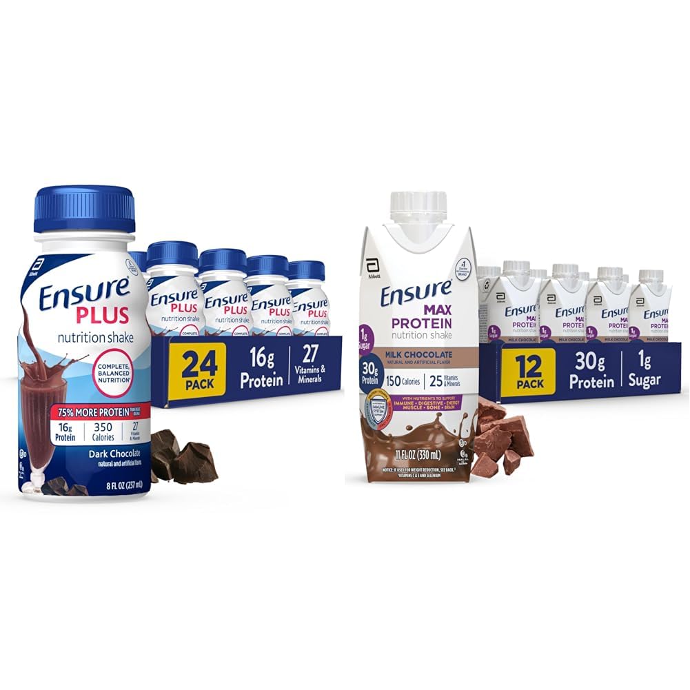 Ensure Plus Nutrition Shake, 24 Count, With 16 Grams of Protein, Meal Replacement Shakes, 8 Fl Oz (Pack of 24), Rich Dark Chocolate, 192 Fl Oz Ensure Plus nutrition shakes have 16 grams of protein and 27 vitamins and minerals. Ensure Plus shakes are clinically proven to help people gain weight. They support immune health by supplying protein, vitamins A and D, zinc, and vitamins C and E. These shakes are kosher, halal, and suitable for lactose intolerance. Not for people with galactosemia. Ensure Max Protein Milk Chocolate Nutrition Shake, 30g Protein, 1g Sugar, 4g Comfort Fiber Blend, 12 Pack Ensure Max Protein nutrition shakes provide targeted nutrition to help you stay healthy, active, and energetic. Each delicious ready-to-drink shake has 30g of high-quality protein to help keep muscles strong and satisfy hunger. Ensure Max Protein also has 150 nutritious calories, plus 25 essential vitamins and minerals, including vitamins A and D, zinc, and antioxidants (vitamins C and E) to support immune health. From Ensure, the 1 doctor-recommended brand.† Enjoy our new flavors Creamy Peach Cherry Cheesecake. This product is gluten-free and suitable for lactose intolerance.‡† Among doctors who recommend liquid nutritional products to their patients. ‡ Not for people with galactosemia. In select stores. The SNAP (Supplemental Nutrition Assistance Program) name is a service mark of the US Department of Agriculture. USDA does not endorse any goods, services, or enterprises.Product 2: - IMMUNE SYSTEM SUPPORT: An excellent source of zinc, vitamins A D, and antioxidants (vitamins C E and selenium) for immune system support. Product 2: - SUPPORTS DIGESTIVE HEALTH: Contains 4g comfort fiber blend with 1g prebiotic fiber to support digestive health. Product 2: - 25 VITAMINS MINERALS: Formulated with nutrients to support immune, bone, and brain health, as well as energy metabolism. Product 2: - 30g PROTEIN 1g SUGAR: Each Ensure Max Protein shake has 30g protein to help build muscle and satisfy hunger. Product 1: GREAT TASTE: A great tasting way to get protein and antioxidants (Vitamins C and E) every day. Product 1: COMPLETE NUTRITION: Each Ensure Plus Shake provides 350 calories and 13 grams of protein and 27 vitamins and minerals to provide you with complete nutrition at just over 1 per serving. Product 1: STRENGTH and ENERGY: Nutrition scientifically designed for Strength and Energy. Product 1: IMMUNE SYSTEM SUPPORT: Nutrients to support immune system health with protein, vitamins A and D, zinc, and antioxidants ( Vitamins C and E).