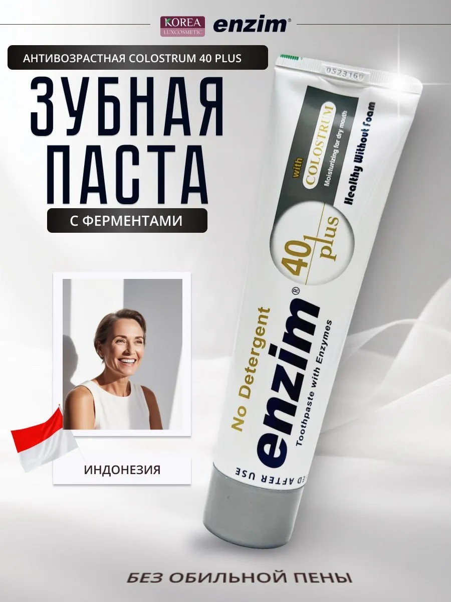 Enzim Антивозрастная зубная паста (120гр) With Colostrum 40 Plus -уникальная, зубная паста для ежедневного использования, способствует увлажнению в полости рта. Особенно важна эта зубная паста для людей старше 40лет. С возрастом организм человека, теряет влагу, и очень важно, чтоб слизистые в полости рта сохранили ph баланс.