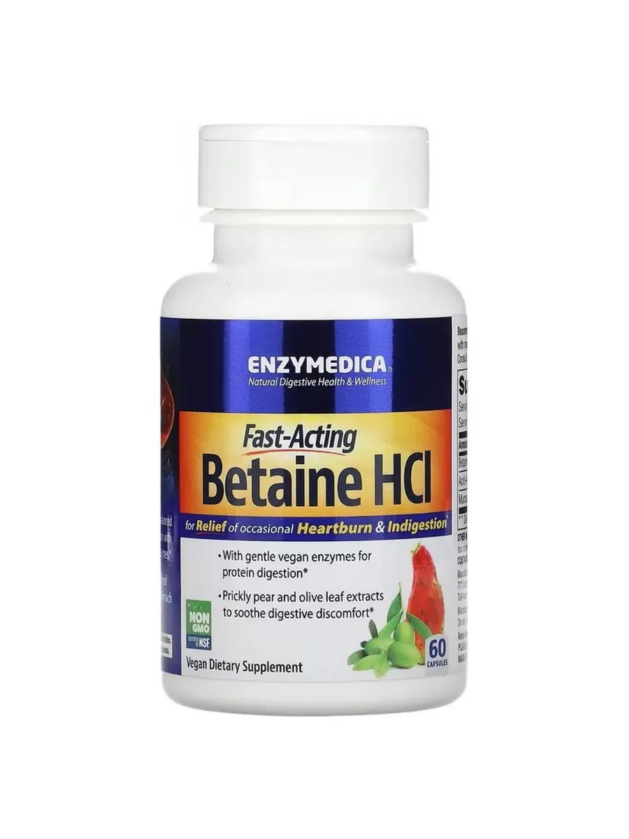 Betaine hydrochloride contains a mild acid that helps maintain a balanced stomach and speed digestion with the right amount of protein-digesting enzymes.