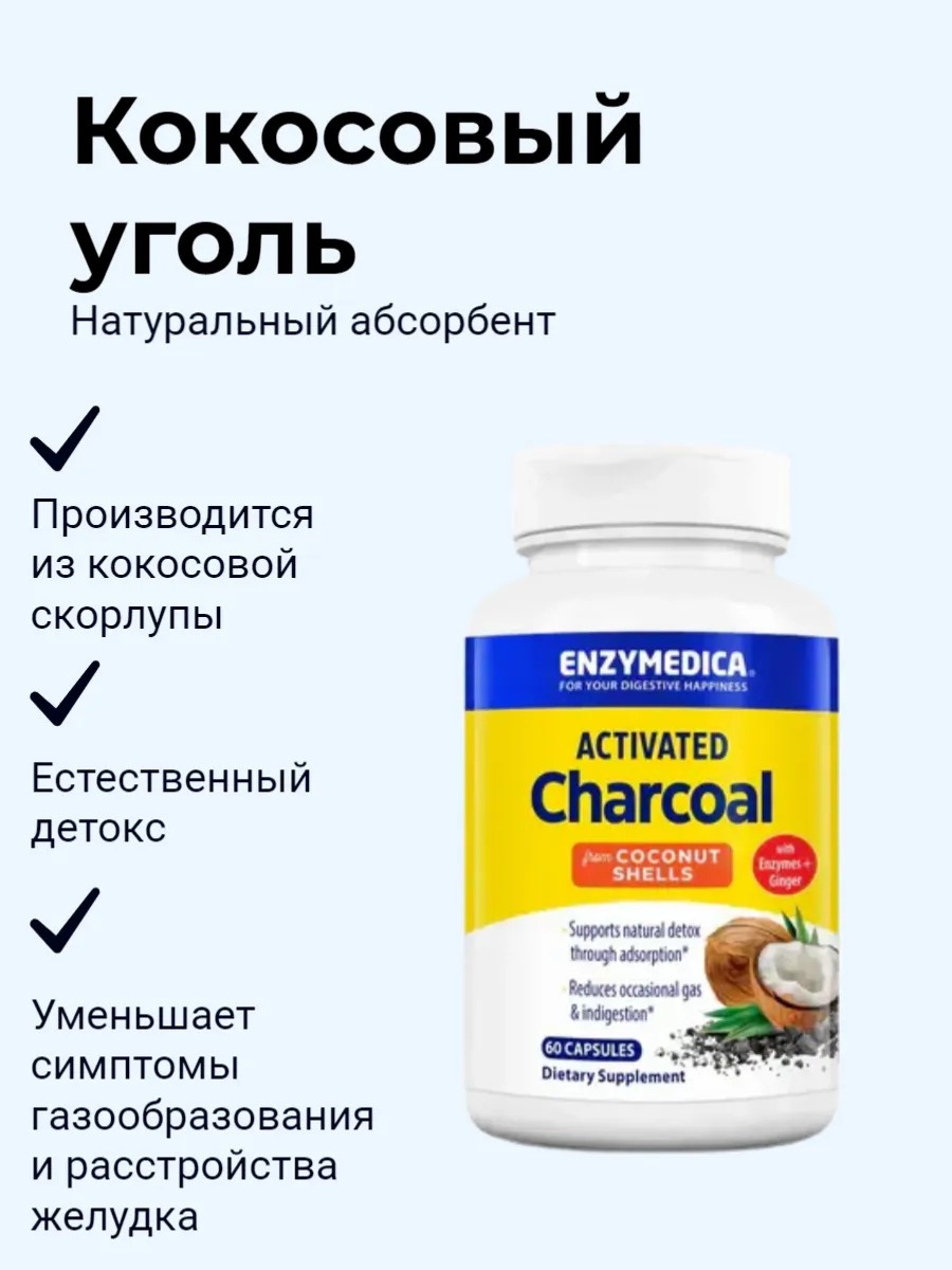 Enzymedica Кокосовый уголь, Coconut activated charcoal, 60 капсул