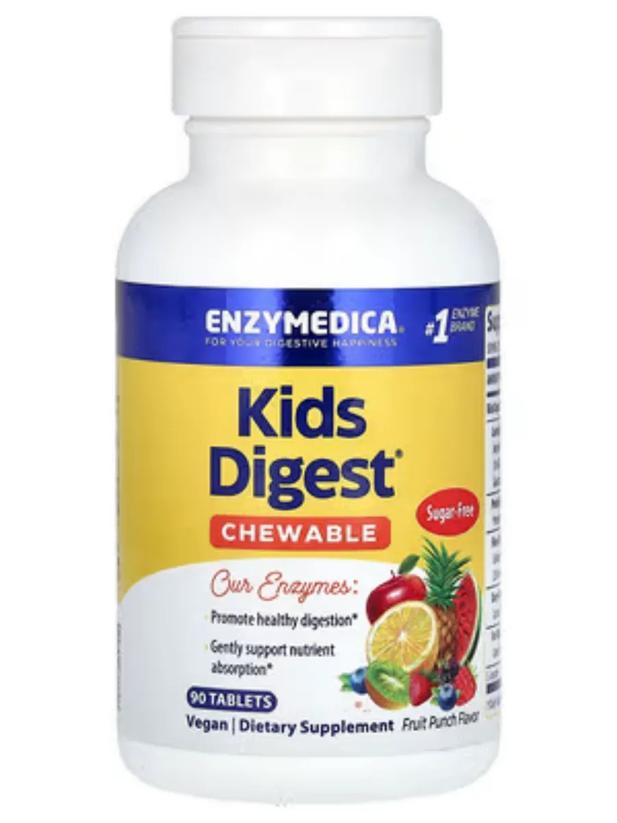 Kids Digest contains digestive enzymes that help the body break down food components like fats, fiber, proteins, and carbohydrates.