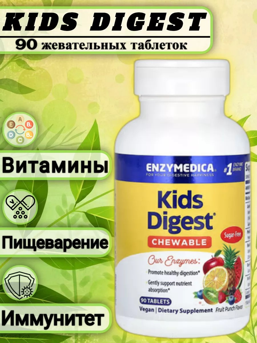 Kids Digest содержит пищеварительные ферменты, которые помогают организму расщеплять такие компоненты пищи, как жиры, клетчатку, белки и углеводы. Ферменты имеют решающее значение для усвоения питательных веществ, а также могут уменьшить газообразование, вздутие живота и несварение вследствие употребления нездоровой пищи.