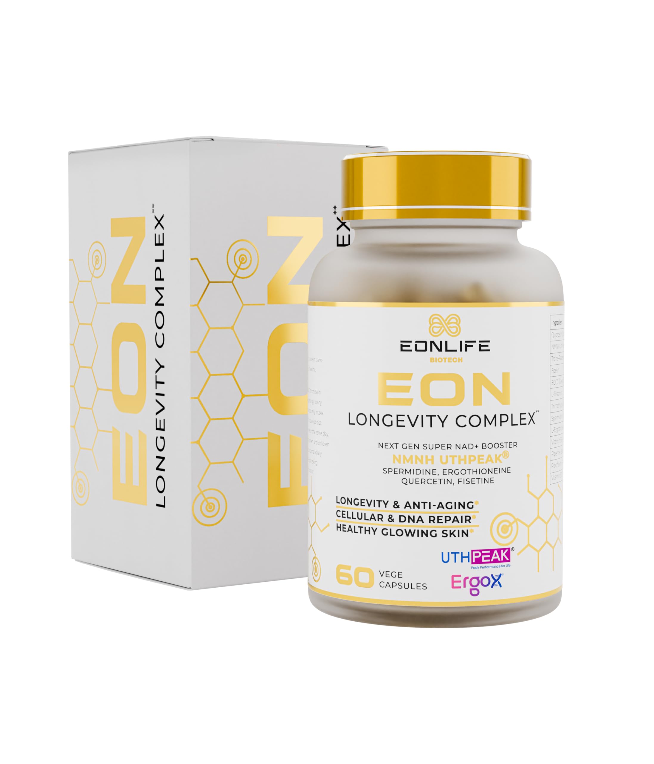 EON Longevity Complex–Complément anti-âge avancé à13 ingrédients actifs NMNH UTHPEAK , Spermidine, Ergothionine, Resvératrol Fisétine-Flacon en verre Énergie cellulaire protection antioxydante