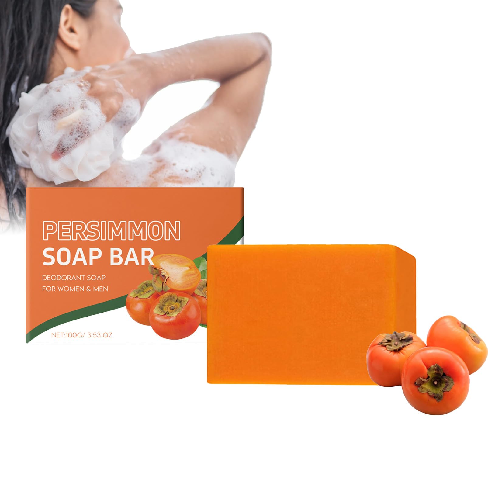 EONFAVE Persimmon Soap - Natural Soap - Persimmon Soap - Eliminates Body Odor - For Men and Women - Moisturizing - Brightening - Deep Cleansing for Face and Body - Exfoliating (100g) Features: ? Deeply cleanses the skin and effectively removes sweat and oil. ? Soft lather, natural and safe ingredients. ? Moisturizes and hydrates the skin. ? Easy to use, compact and portable. ? Brightens the skin and gives it a radiant glow. ? Can be used on the face and body, suitable for all skin types. Package Contents: Persimmon Soap SAFETY WARNING NoConvenient: This bar of shower soap is easy to lather and compact, perfect for on-the-go use. Take it with you when you travel for an effective deep cleanse. The solid soap also makes a perfect gift for loved ones and offers a long-lasting cleansing effect, making it a great choice for the whole family. Easy to use: Place a bar of shower soap for men and women in a foaming net, moisten with water to create a rich lather, and apply to the face and body. You can use the Presimmon soap-based soap to cleanse your face, hands, neck, bikini line, inner thighs, and underarms. The natural khaki soap is suitable for all skin types and can pamper your entire body. Nourishing and moisturizing: Enriched with hyaluronic acid, olive oil, and coconut oil, the khaki soap has a moisturizing effect and prevents dry or tight skin. The fine lather penetrates deeply into the skin and gently removes impurities while retaining moisture to nourish and improve its condition. Gentle formula: This persimmon soap is made from natural ingredients. Presimmon Natural Soap is enriched with persimmon extract, glycerin, olive oil, coconut oil, and lemon oil. The safe, natural ingredients make your skin glow from within and leave it more radiant. Deep cleansing: Our persimmon face and body soap deeply cleanses pores, effectively removes body odor and oil, restores your skin's natural radiance, and tones your skin, leaving you feeling clean and refreshed all day long.EONFAVE Savon Kaki - Savon naturel Presimmon - Savon kaki - Élimine les odeurs corporelles - Pour hommes et femmes - Hydratant - Éclaircissant - Nettoyage en profondeur pour le visage et le corps 100 g (1er Pack)DESCRIPTION DU PRODUIT DESCRIPTION DU PRODUIT EONFAVE Savon Kaki - Savon naturel Presimmon - Savon kaki - Élimine les odeurs corporelles - Pour hommes et femmes - Hydratant - Éclaircissant - Nettoyage en profondeur pour le visage et le corps - Exfoliant (100 g) Fonctionnalités : ? Nettoie la peau en profondeur et élimine efficacement la sueur et l'huile Mousse douce, ingrédients naturels et sûrs. Hydrate et hydrate la peau. Facile à utiliser, compact et portable. Éclaircit la peau et fait briller la peau de l'intérieur. Peut être utilisé sur le visage et le corps, convient à tous les types de peau. Contenu de l'emballage : Savon de kaki. AVERTISSEMENT DE SÉCURITÉ NonPratique : ce morceau de savon de douche est facile à mousser et compact, parfait pour une utilisation en déplacement. Emportez-le avec vous en voyage pour un nettoyage efficace en profondeur de la peau. Le savon solide est également parfait comme cadeau pour vos proches et offre un effet nettoyant durable, ce qui en fait un bon choix pour toute la famille. Facile à utiliser : placez un morceau de savon de douche pour homme et femme dans un filet en mousse, humidifiez avec de l'eau pour créer une mousse riche, et appliquez sur le visage et le corps. Vous pouvez utiliser le savon à base de savon Presimmon pour nettoyer le visage, les mains, le cou, le maillot, l'intérieur des cuisses et des aisselles. Le savon naturel kaki convient à tous les types de peau et peut dorloter tout le corps. Nourrissant et hydratant : le savon kaki enrichi en acide hyaluronique à l'huile d'olive et à l'huile de noix de coco a un effet hydratant et prévient les peaux sèches ou tendues. La mousse fine pénètre profondément dans la peau et élimine en douceur les impuretés tout en préservant l'hydratation pour nourrir la peau et améliorer son état. Formule douce : ce savon de kaki est fabriqué à partir d'ingrédients naturels. Le savon naturel Presimmon est enrichi en extrait de kaki, glycérine, huile d'olive, huile de coco et huile de citron. Les ingrédients naturels et sûrs font briller votre peau de l'intérieur et rendent votre peau plus transparente. Nettoyage en profondeur : notre savon kaki pour le visage et le corps nettoie en profondeur les pores, élimine efficacement les odeurs corporelles et l'huile, restaure l'éclat naturel de votre peau et tonifie votre peau, de sorte que vous vous sentirez propre et rafraîchie tout au long de la journée.