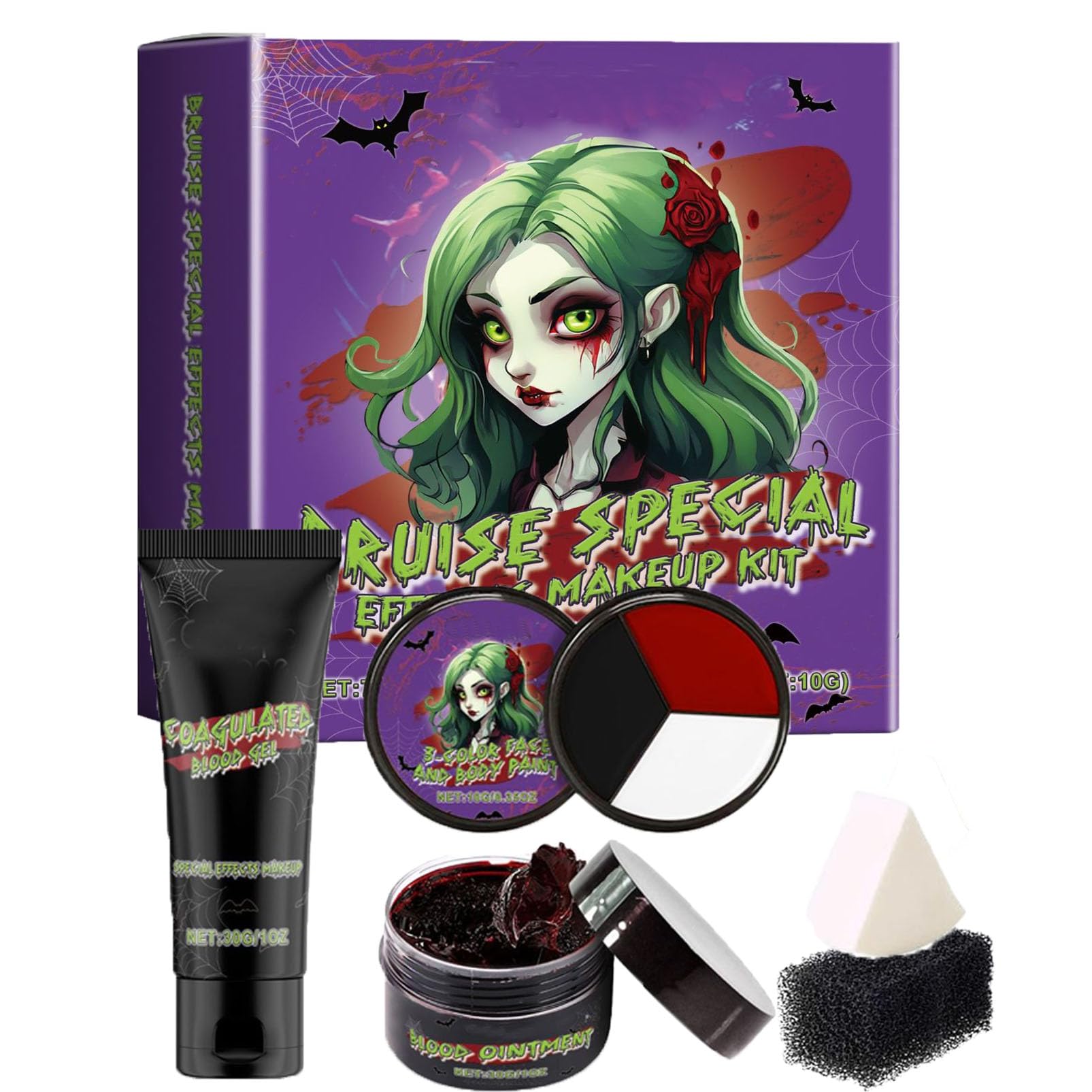 Halloween Vampire Makeup Kit - 30g Blood Gel 30g Blood Paste 10g Tri-Color Palette SAFETY WARNING Keep out of reach of children. Do not allow contact with eyes.