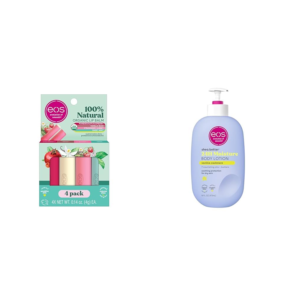 eos 100 Natural Organic Lip Balm Sticks- Strawberry Sorbet, Vanilla Bean, Sweet Mint Pomegranate Raspberry, Lip Care Products, 0.14 oz, 4-Pack Discover a lip balm that's 100 natural, organic, and delicious. This 4-pack contains Strawberry Sorbet, Sweet Mint, Pomegranate Raspberry, and Vanilla Bean flavors. Our USDA Certified Organic, dermatologist-recommended lip balm is formulated for sensitive skin and made with soothing shea butter, weightless coconut oil, and protective antioxidants. eos lip balms use sustainably sourced ingredients that provide all-day moisture and are sure to leave your lips feeling buttery smooth, hydrated, and with a delicious taste all day long. eos Shea Better Body Lotion- Vanilla Cashmere, 24-Hour Moisture Skin Care, Lightweight Non-Greasy, Made with Natural Shea, Vegan, 16 fl oz Our sweet and nuzzly Vanilla Cashmere body lotion captures the warmth of whipped vanilla, the softness of musk and the coziness of the caramel for a rich, luxurious fragrance with a sensual twist. eos 24H body lotion with instantly moisturizing Shea Oil lasting protection Shea Butter quickly absorbs for 24-hour hydration. Say hello to… fast-absorption, lightweight, soft skin, and sustainable shea. Say goodbye to… greess, heaviness, and sticky residue.Product 2: 24-HOUR MOISTURE FOR YOUR BODY: Soothe and protect your skin with our lightweight and non-greasy lotion. No sticky residue or heaviness, just all-day hydration and smooth skin. Product 2: SHEA BETTER BODY LOTION: Our sweet and nuzzly Vanilla Cashmere scent contains fragrance notes of whipped vanilla, soft musk and cozy caramel. eos 24-hour hydration body lotion is made with natural ingredients to leave your skin smooth from head-to-toe. Product 1: MADE FOR SENSITIVE SKIN: Our Dermatologist-recommended lip balm is formulated for sensitive skin and hypoallergenic. Product 1: ALL-DAY MOISTURE: Our lip balms are packed with powerful skincare ingredients like sustainable shea butter oil that locks-in moisture for lasting protection, nourishing coconut oil for weightless hydration, relieving jojoba oil that replenishes irritated lips, and a protective blend of antioxidants. Product 1: 100 NATURAL ORGANIC: Our USDA Certified Organic lip balms are made with high-quality ingredients and have single-note flavors that taste lighter and cleaner just like they came from nature. Product 1: VARIETY 4-PACK LIP BALMS: This 4-pack contains our best 100 natural organic flavors: strawberry sorbet, sweet mint, pomegranate raspberry, and vanilla bean.