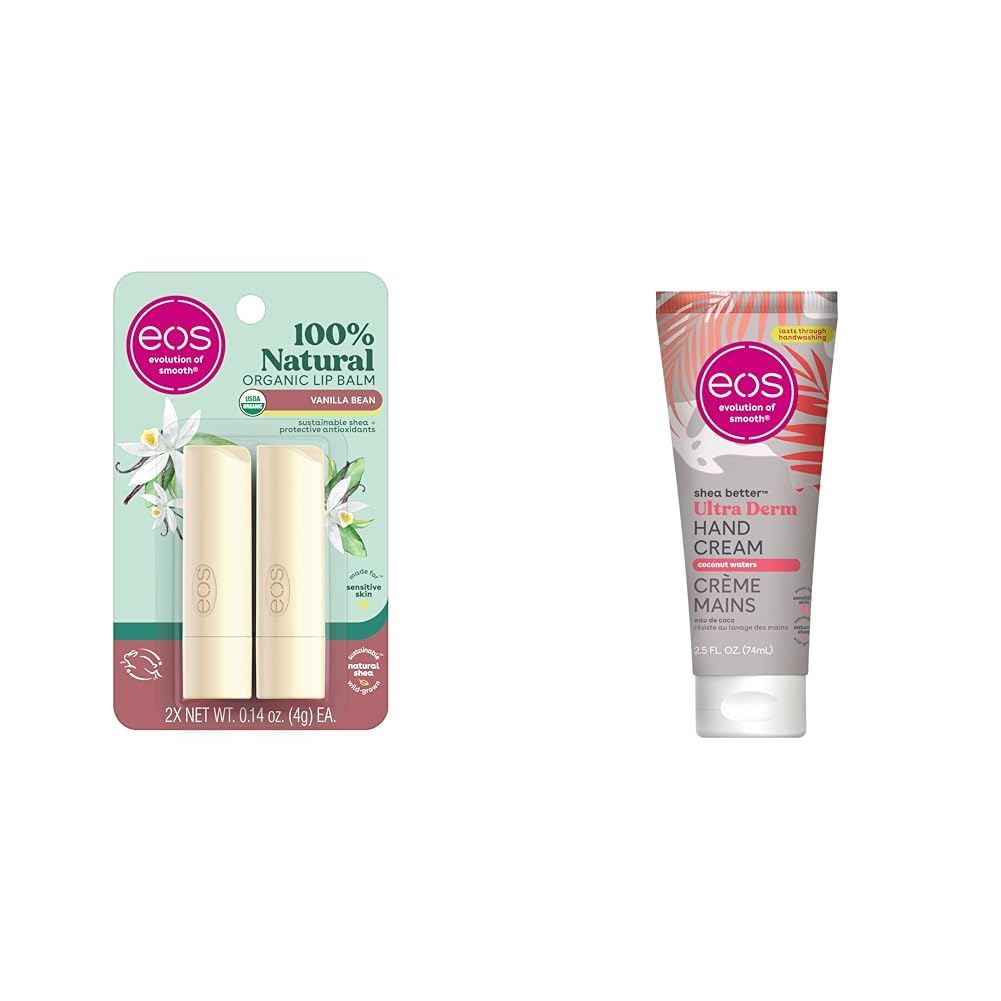 eos 100 Natural Organic Lip Balm Sticks- Vanilla Bean, All-Day Moisture, Dermatologist Recommended, 0.14 oz, 2-Pack Discover a lip balm that's 100 natural, organic, and delicious. Our all-natural Vanilla Bean flavor tastes like smooth, rich and creamy vanilla. eos USDA Certified Organic, dermatologist-recommended lip balm is formulated for sensitive skin and made with soothing shea butter, weightless coconut oil, and protective antioxidants. eos lip balms use sustainably sourced ingredients that provide all-day moisture and are sure to leave your lips feeling buttery smooth, hydrated, and with a delicious taste all day long. eos Shea Better Hand Cream - Coconut, Natural Shea Butter Hand Lotion and Skin Care, 24 Hour Hydration with Shea Butter Oil, 2.5 oz, Packaging May Vary eos Shea Better Hand Cream is all around awesome. Our warm sun-kissed Coconut scent contains fragrance notes of creamy coconut, lush hibiscus, and solar musk. eos lotion for dry skin delivers 24-hour hydration and brings together the super powers of lightweight shea oil and ultra-rich shea butter for both immediate moisture and lasting protection – that even lasts through hand-washing! Plus, our beautiful fragrances leave your hands smelling pretty great. Like we said, eos hand creams are all around awesome.Product 2: 24-HOUR HYDRATION FOR YOUR HANDS: eos 24-hour hydration hand lotion lasts through hand washing is made with natural ingredients to leave your hands feeling smooth Our collection of incredible hand cream fragrances will delight in application and last all day on skin. Product 2: SHEA BETTER HAND CREAM: eos lotion has a warm sun-kissed Coconut scent contains fragrance notes of creamy coconut, lush hibiscus, and solar musk. Product 1: MADE FOR SENSITIVE SKIN: Our Dermatologist-recommended lip balm is formulated for sensitive skin and hypoallergenic. Product 1: ALL-DAY MOISTURE: Our lip balms are packed with powerful skincare ingredients like sustainable shea butter oil that locks-in moisture for lasting protection, nourishing coconut oil for weightless hydration, relieving jojoba oil that replenishes irritated lips, and a protective blend of antioxidants. Product 1: 100 NATURAL ORGANIC: Our USDA Certified Organic lip balms are made with high-quality ingredients and have single-note flavors that taste lighter and cleaner just like they came from nature. Product 1: VANILLA BEAN: Our all-natural Vanilla Bean flavor tastes like smooth, rich and creamy vanilla.